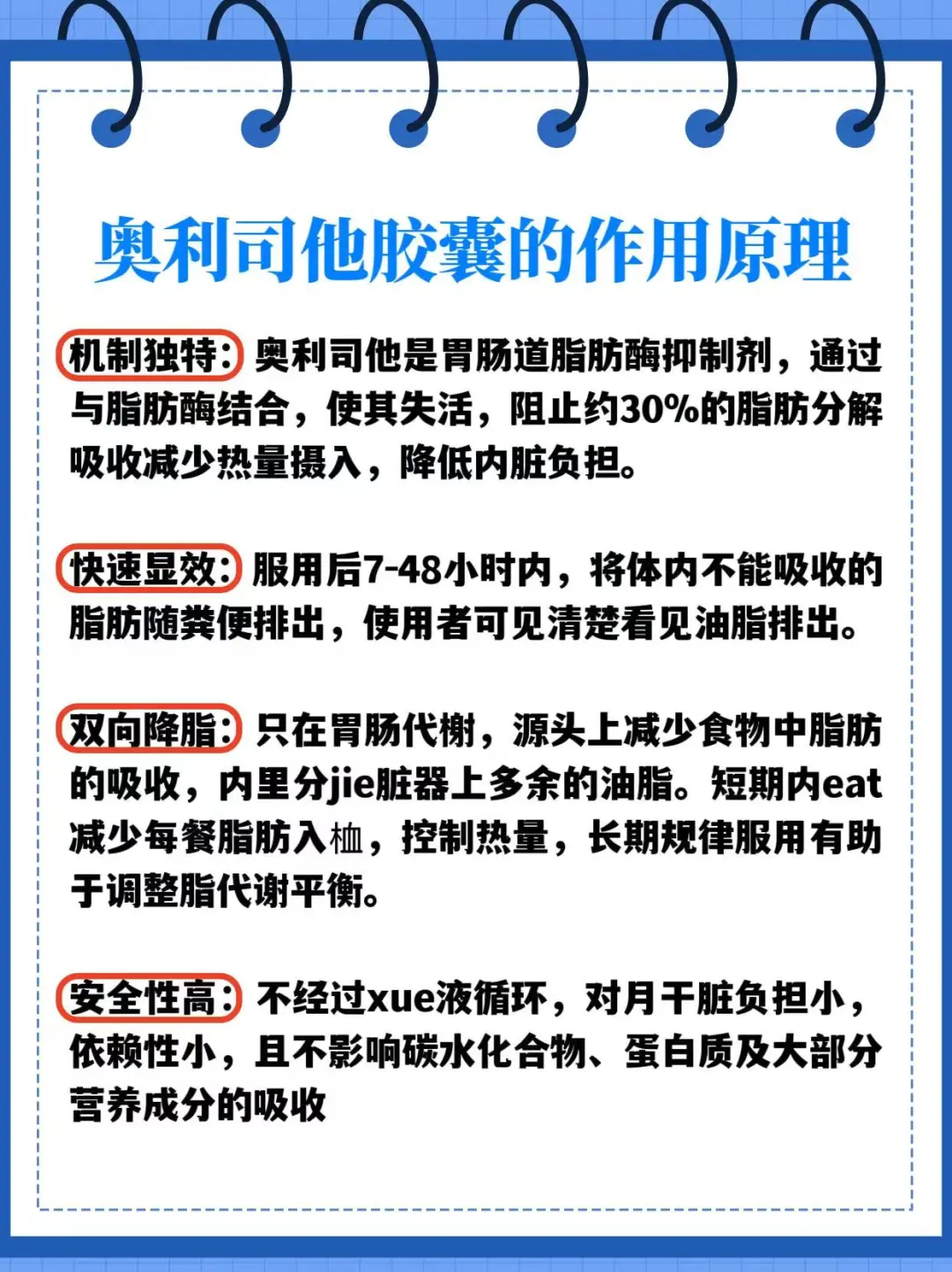 今日打卡学习:奥利司他胶囊 适用症: 迪诺洛克适用于肥胖huan者和伴发(`O′)险因素(高血压、糖尿病和高血脂症)的超重患者。 用法用量:餐时或者是餐后马上服用1粒如果一餐未进食可以省略一次 2-3 粒/日,1 粒/次,每日不超过 3次 ★注意事项: 奥利司他会影响脂溶性维生素(如维生素 A、D、E)的吸收,所以在使用过程中需要适当补充这些维生素。