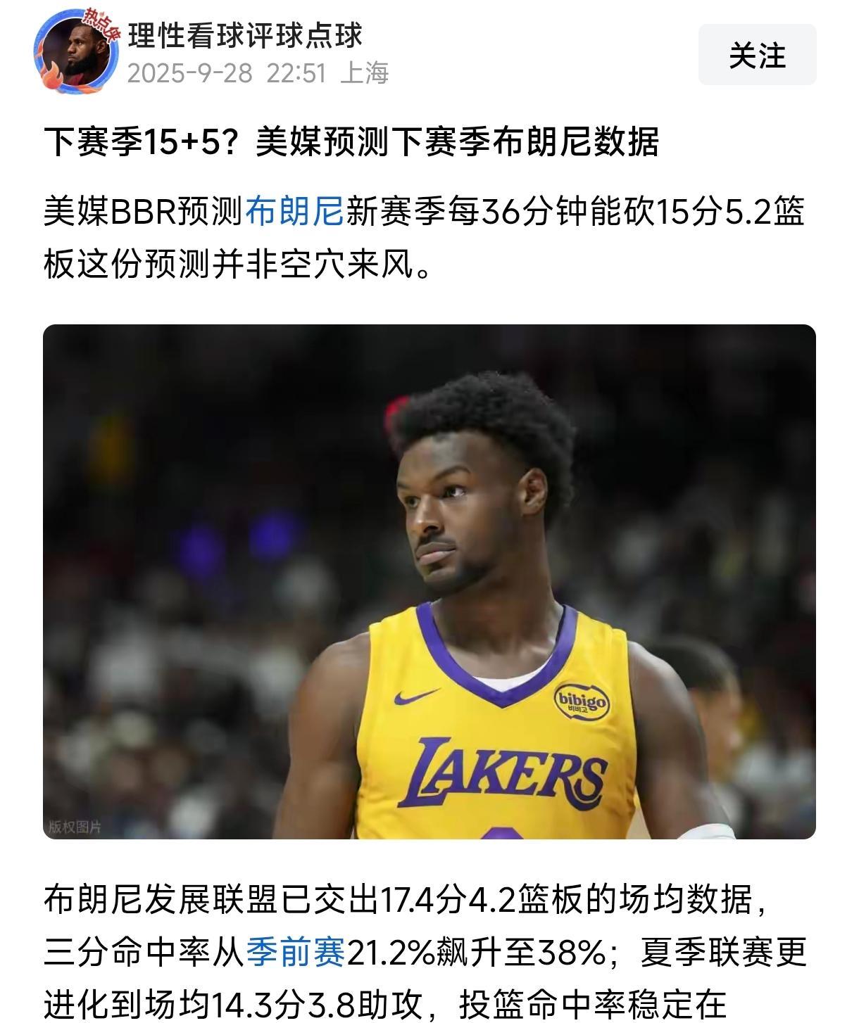 你没有看错布朗尼将迎来超级爆发, 美媒预测下赛季达到15分5个篮板, 理由是在发展联盟已经拿到17分4个篮板。 这种思维是不是很奇葩? 克内克特上赛季还是夏联赛的得分王。 布朗尼能进入常规轮换都难, 大概率还是垃圾时间上场打打酱油, 其作用还是保证球队的票房上, 满足球迷看布朗尼的要求。 湖人这套阵容缺内线协防人和外线领防人, 布朗尼的出场时间根本保证不了, 他和文森特的作用明显是重合的, 文森特的综合能力和经验都比他强, 除非文森特和东契奇受伤了, 布朗尼才能有稳定的出场时间。