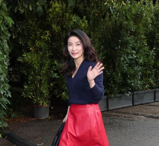郭晶晶现身米兰时装周,郭晶晶身着蓝色毛衣,下身搭配一条红色皮裙,脚蹬黑色皮鞋。她
