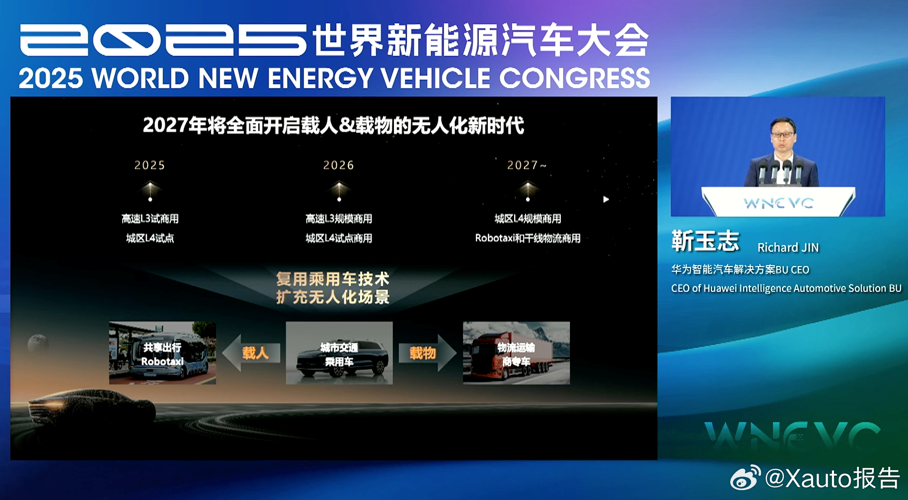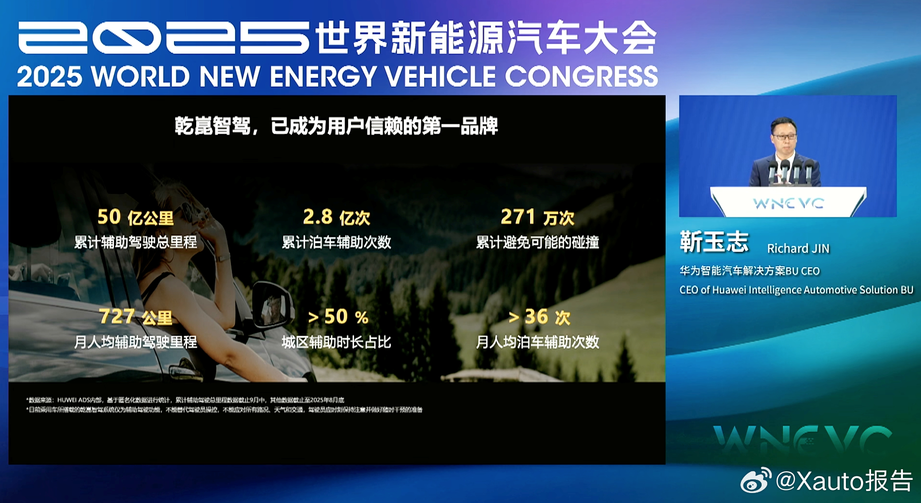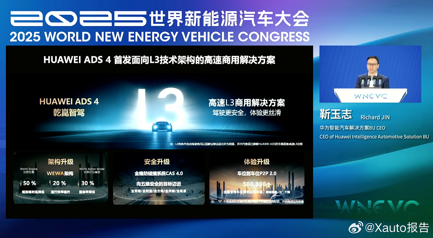 9月28日,在2025世界新能源汽车大会(WNEVC 2025)上,华为智能汽车解决方案BU CEO靳玉志分享了对汽车产业发展趋势的洞察,并介绍了华为乾崑智驾的最新进展。