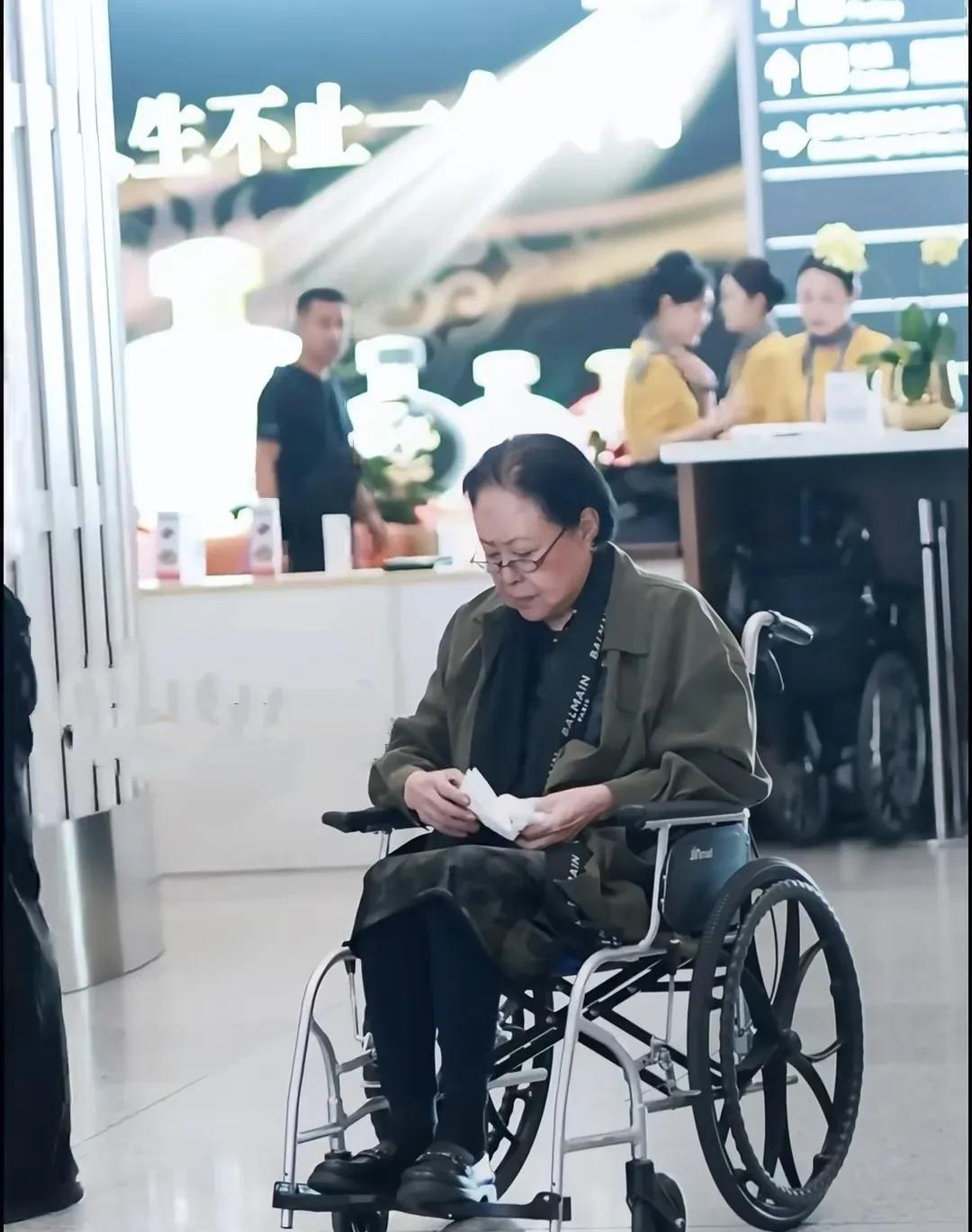 75岁的著名演员斯琴高娃,现身机场,坐着轮椅,头发稀疏,脸色暗沉,戴着老花镜,精