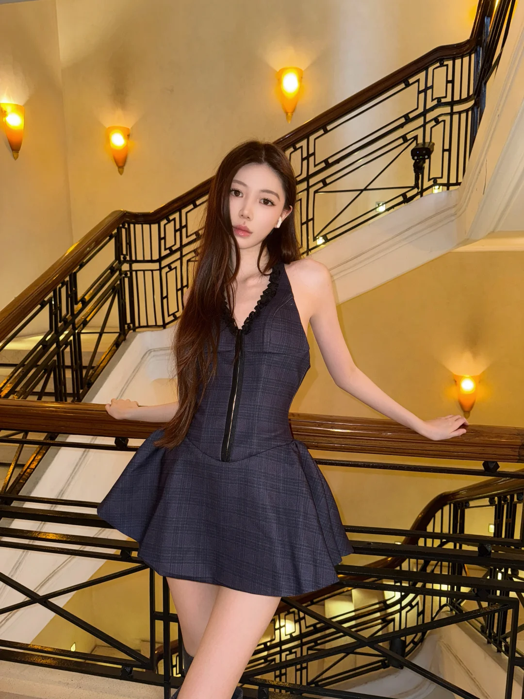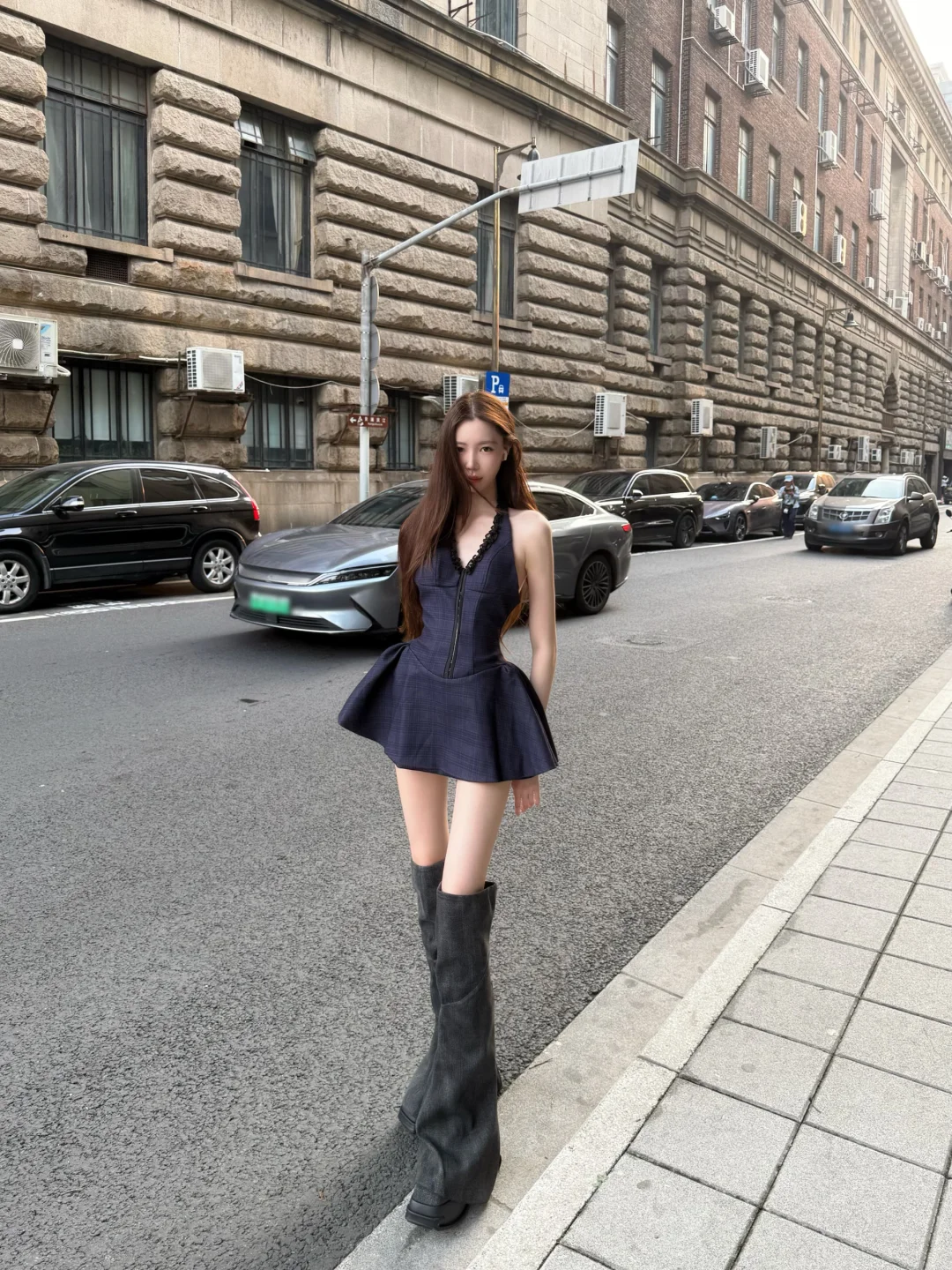蓝色V领连衣裙简直是高端女神范儿的标配,商务场合穿它气场直接拉满!束腰让身材
