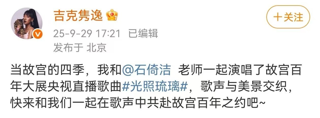 故宫和吉克隽逸合作了 故宫和吉克隽逸的合作,简直是一场梦幻联动!故宫有着深厚的文化积淀,吉克隽逸有着无限的创造力。当两者相遇,就像古老的音乐与现代的节奏完美融合。吉克隽逸这次又给了大家一个巨大的惊喜,作为事业粉,真的为她感到骄傲! ​​​