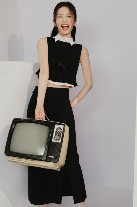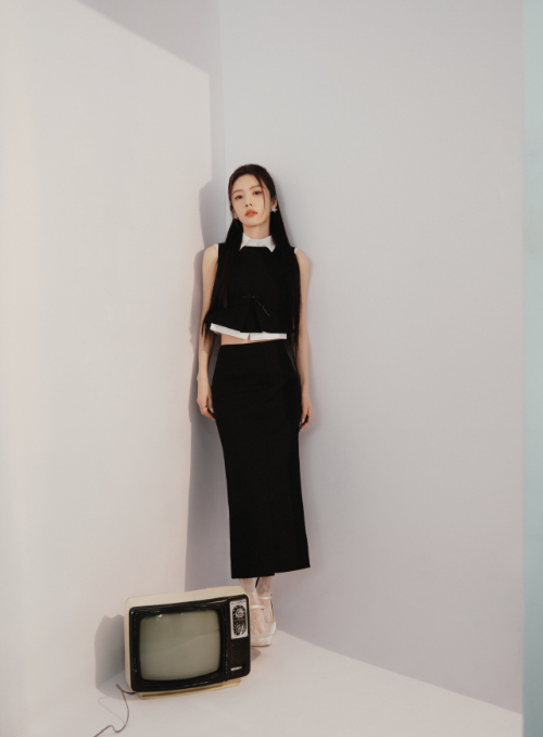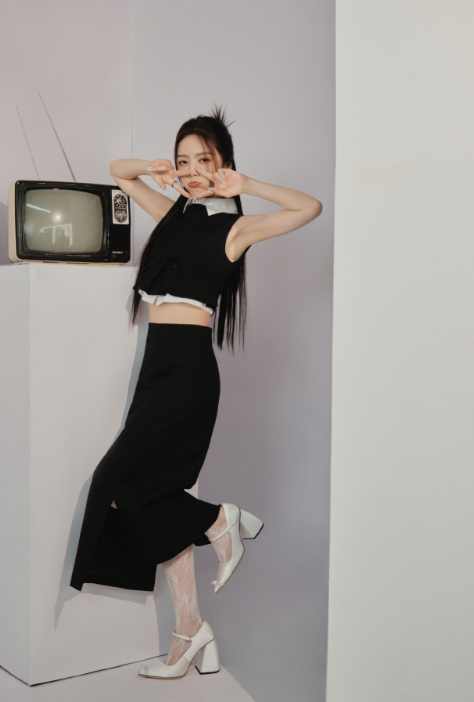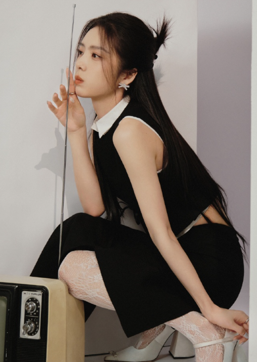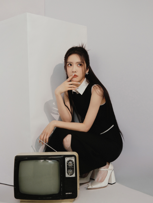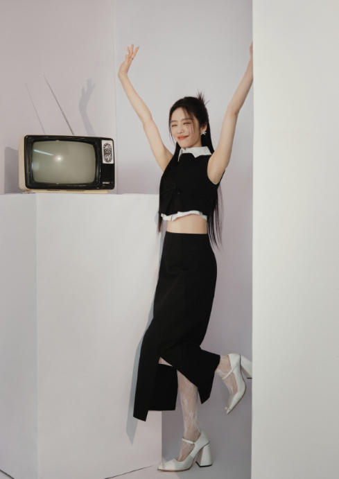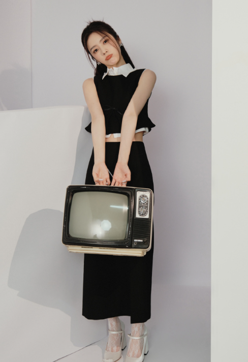 蔡文静的黑裙搭配白色绣花渔网袜,甜美治愈很可以!