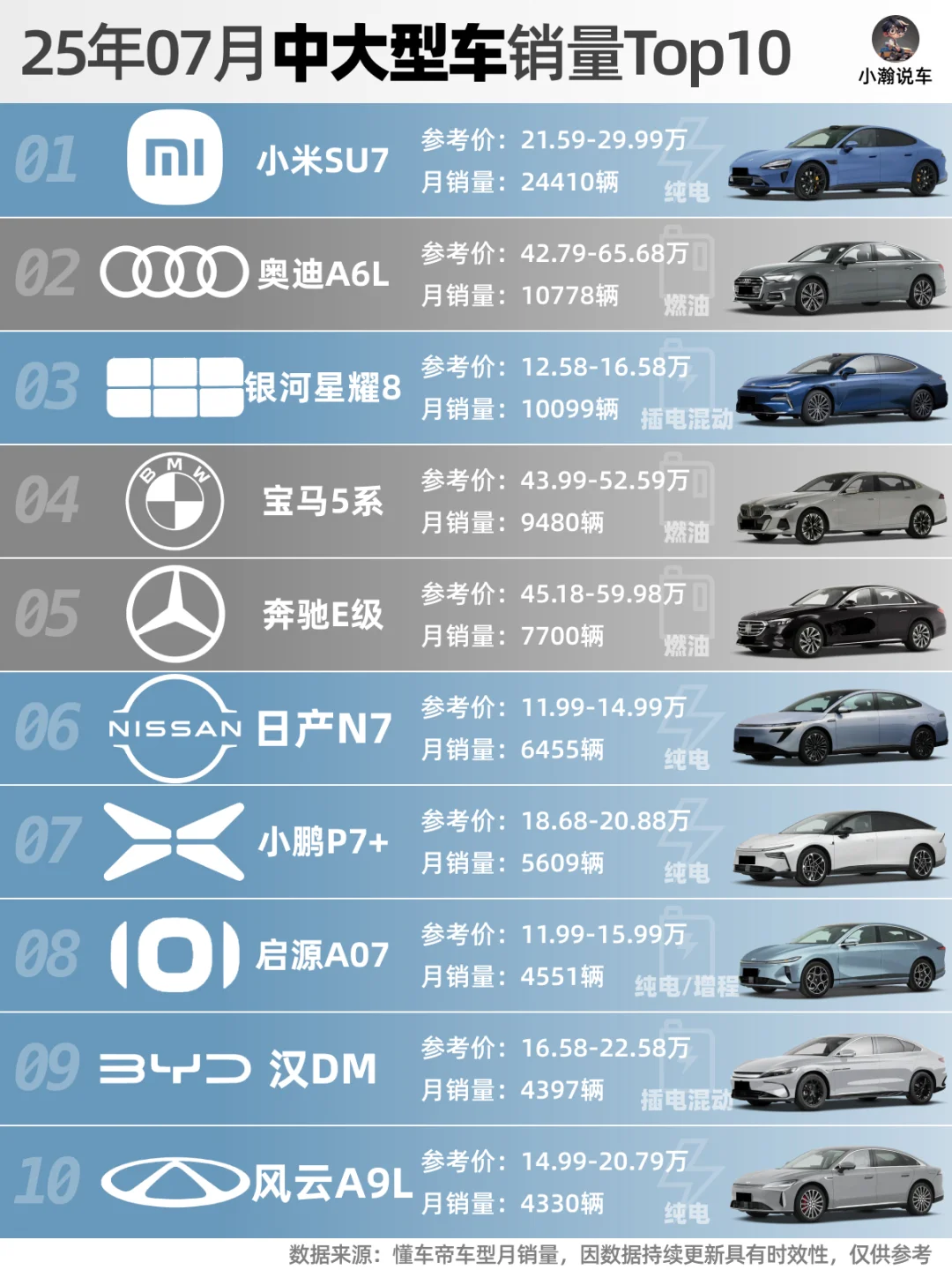 🌟中大型车:小米SU7依旧断层ling先,不过雷总快多谢产能给YU7吧。银河另一爆款星耀8月销破万升至第三。而BBA的56E依然稳定在前5位,这个级别的豪华轿车,国产品牌仍需努力。