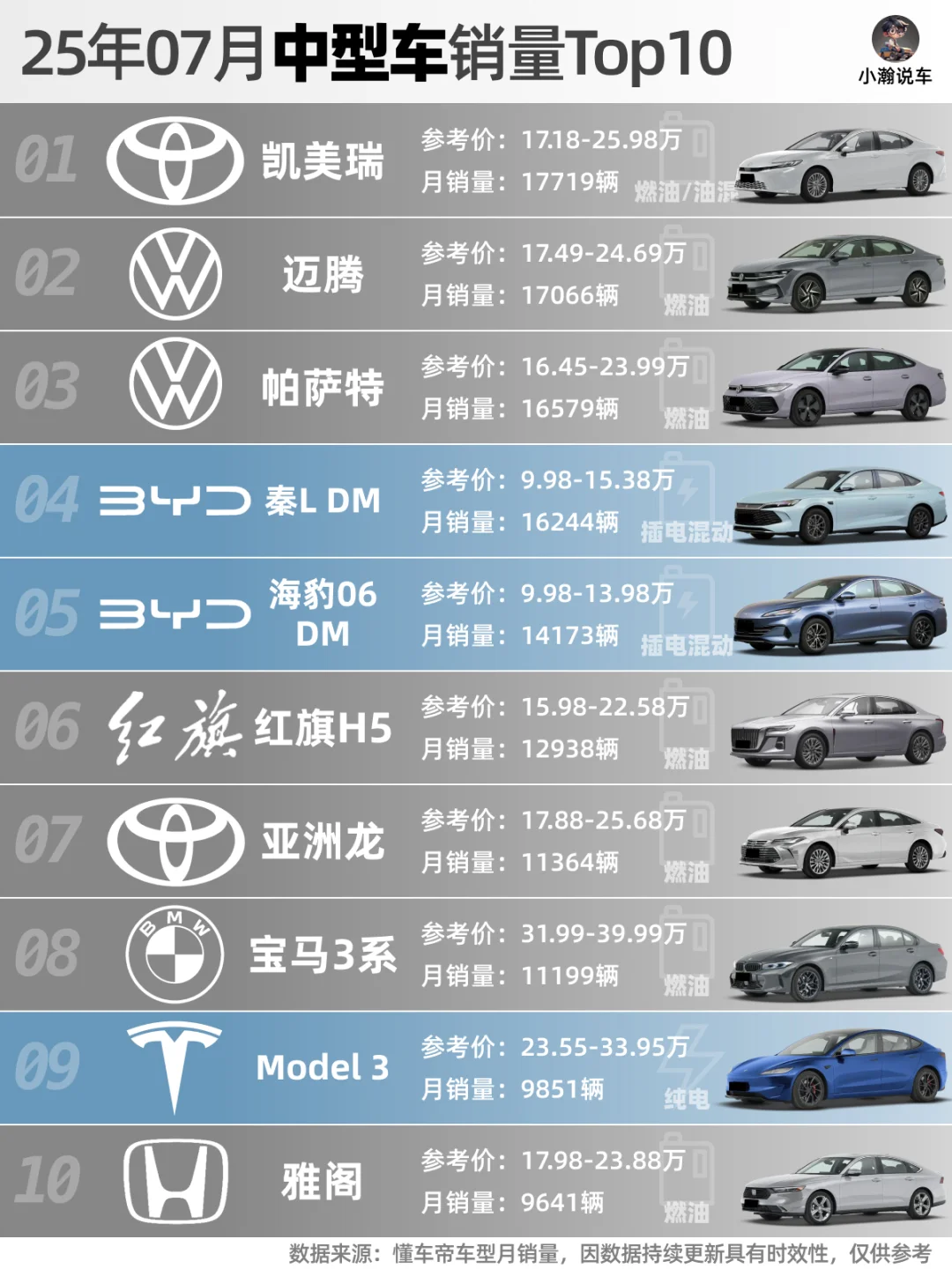 🌟中型车:凯美瑞迈腾帕萨特占据前三名。秦LDM下跌至第四,其姊妹车型海豹06DM排在第五。特斯拉Model3销量跌破1万,下降至第9。