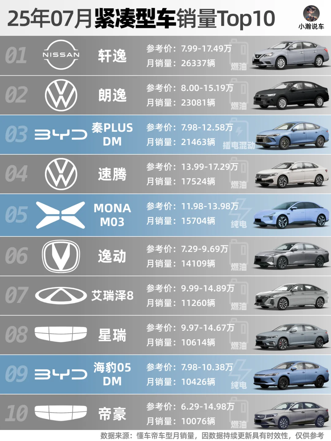🌟紧凑型车:日产轩逸重回榜首,秦Plus DM涨价后跌破3万台降至第三。小鹏MonaM03冲进前五。值得一提的是7月新上市的爆款零跑B01销量已接近万台,你觉得他下个月会冲到第几位?