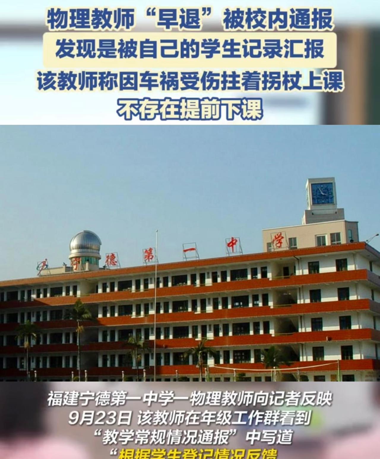 隔着屏幕都能感受到福建这位老师的绝望…… 宁德第一中学高二(3)班的物理老师被公开通报“早退”,令人意外的是举报者竟然是班里的学生,他表示自己是车祸后拄着拐坚持在上课,学校没有核实就听信学生的话通报他,又愤怒又委屈。以前都是家长不满意就投诉老师,现在学生也能投诉,直接把老师投成了弱势群体,教室都有监控,如果真的早退可以批评,但如果是恶意诬陷,那学校就没有尽到维护老师的责任。