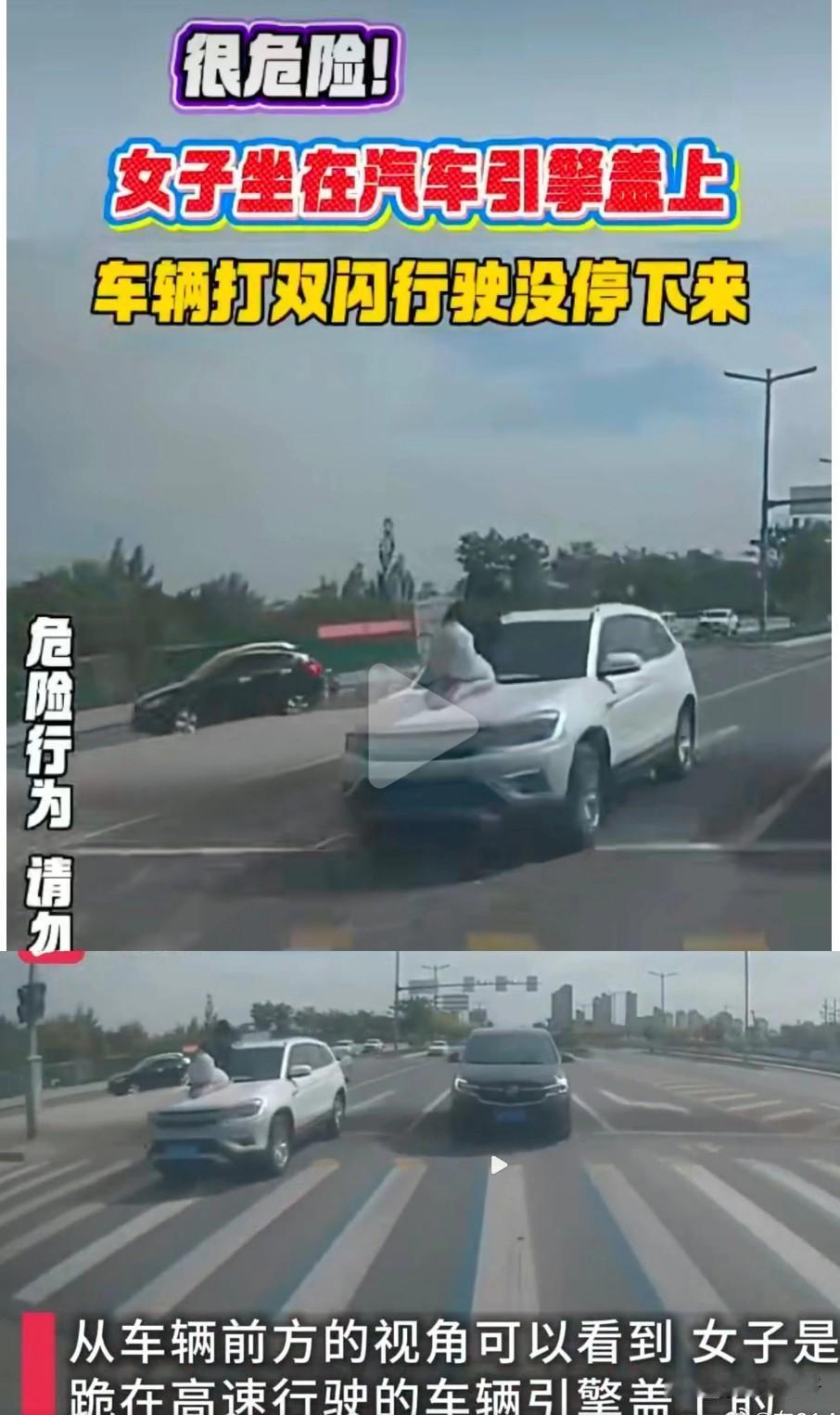 9月28日,甘肃酒泉一女子坐在一辆行驶汽车的引擎盖引发关注。据说是夫妻间发生家庭内部矛盾所致,已由当地公安部门介入处置。 一个敢坐一个敢开,再大的矛盾也不能做这种极端危险的事情,这是对生命、对家庭、对公共安全极不负责任的鲁莽行为。一旦出事,造成交通事故,后悔都来不及。 车辆在行驶中,任何一次急刹、转弯或加速,都可能瞬间将引擎盖上的女子甩飞,导致严重伤亡。而驾驶座的丈夫,但凡有丝毫分心或操作失误,后果不堪设想。一旦发生事故,开车的丈夫将直接面临过失致人重伤或死亡的刑事责任。而坐在引擎盖上的妻子,虽然自身受害,但其行为本身也构成了严重的交通违法,将自己和他人置于险境。这辆汽车就是一个在公共道路上失控的“危险武器”。它威胁的不仅是车上的夫妻,更是所有当时在路上的司机、乘客、行人的安全。因为两个人的私人矛盾,让整个社会承担潜在的风险,这是极度自私和不可原谅的。 再大的矛盾,都不能让情绪冲垮理智的堤坝,做出危及生命的行为。用伤害自己来威胁对方,用绑架安全来宣泄情绪,是解决问题最愚蠢、最无效的方式。