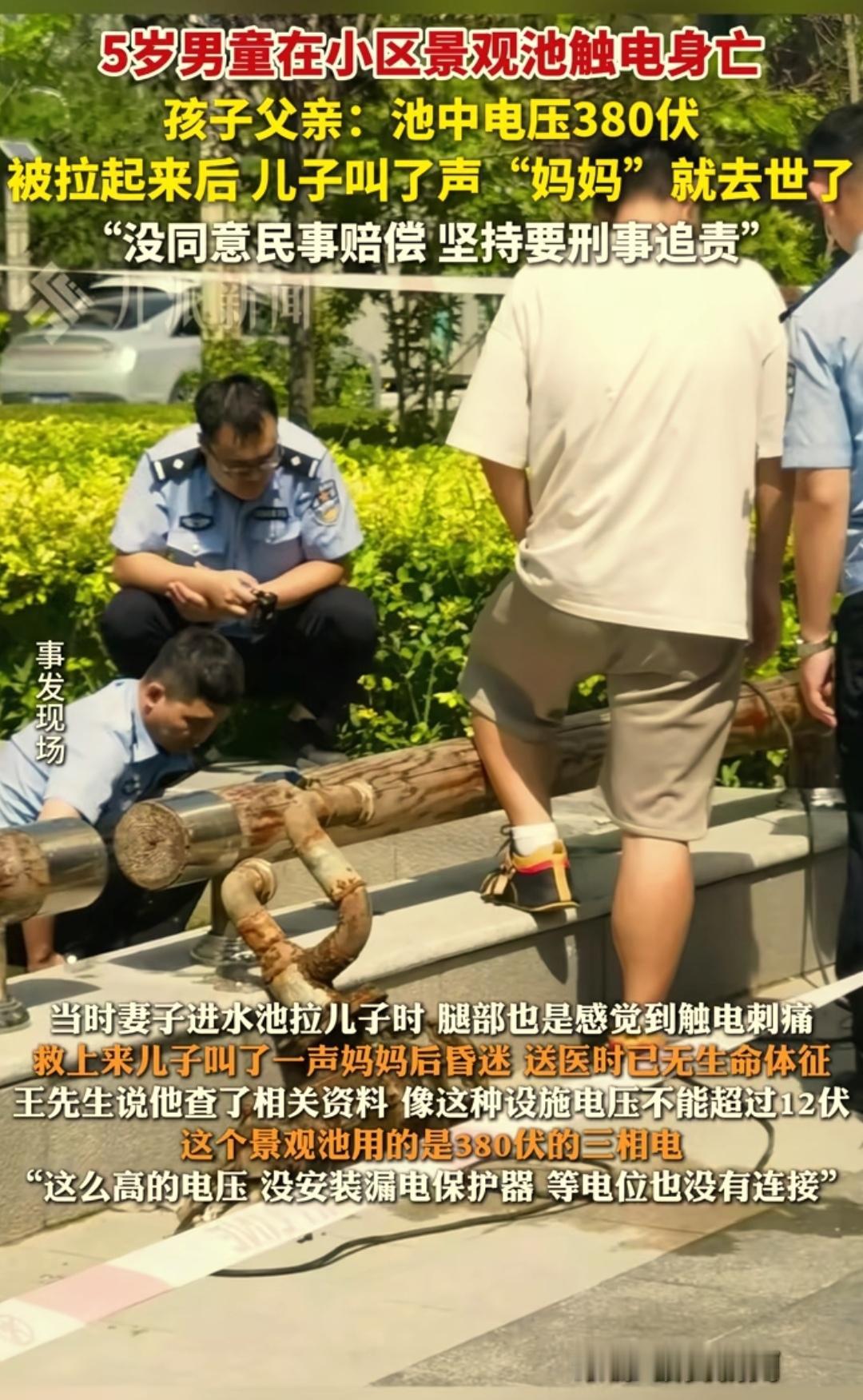 刷到就是躲过!5岁男孩小区景观池捡石子,不幸触电,被拉起来后叫了声“妈妈”,就陷入昏迷,再也没醒过来! 据孩子父亲王先生说,8月9日下午,孩子和妈妈去看望外婆时,在小区跟几个孩子在小区景观池旁边往池子里扔石子,唯独儿子一个人进到池子中捡石子,瞬间,孩子就倒下了。 妈妈急忙下水去拉孩子,腿部明显传来阵阵刺痛感,很明显是设施漏电了,她尽力把孩子抱上来,孩子用尽最后一丝力气叫了一声“妈妈”后,就失去了意识,送到医院时,已经没有了生命体征…… 后来王先生查了相关资料,资料显示景观设施电压一般不能超过12伏,而这个景观池用的是380伏的三相电。如此高的电压,既没有安装漏电保护器,等电位也没有连接。 很多小区的景观池都是完全开放的,而且水池旁边会放很多圆润光滑的石子,有的还很漂亮。特别吸引小孩子过去玩。 虽然大家都知道景观池的水是流动的,肯定是有电的,物业保安也都会提醒,有电注意安全。但是依然会有很多大人带着孩子去玩,根本拦不住。 王先生没有接受小区物业的民事赔偿,至今孩子遗体没有下葬,坚决要刑事追责,目前公安机关已经受理此案。但是,无论怎么追究,孩子都再也回不来了! 有网友说,肯定刑事啊,不然这辈子也放不下! 也有网友说,家长责任不是最大吗?景观池根本不能去玩,已经多次发生触电身亡的事件了。 也有网友说,我从来不让孩子去碰那个水,告诉她那里有电,会噶的。 这个可怜的孩子,才刚刚5岁,正是天真烂漫的年龄,这个鲜活的小生命,却因为物业的不负责任、妈妈的无知,离开了这个世界! 马上要十一假期了,希望所有看到这个事故的家长们,一定要管住孩子,景区和广场等所有地方的景观池,不要去玩!也转发出去提醒更多人,让这样的悲剧不再重演!