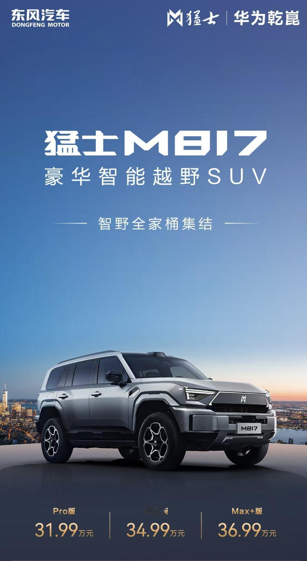 猛士M817Max+上市,售价36.99万元起。新车定位硬派越野车型,配备乾崑