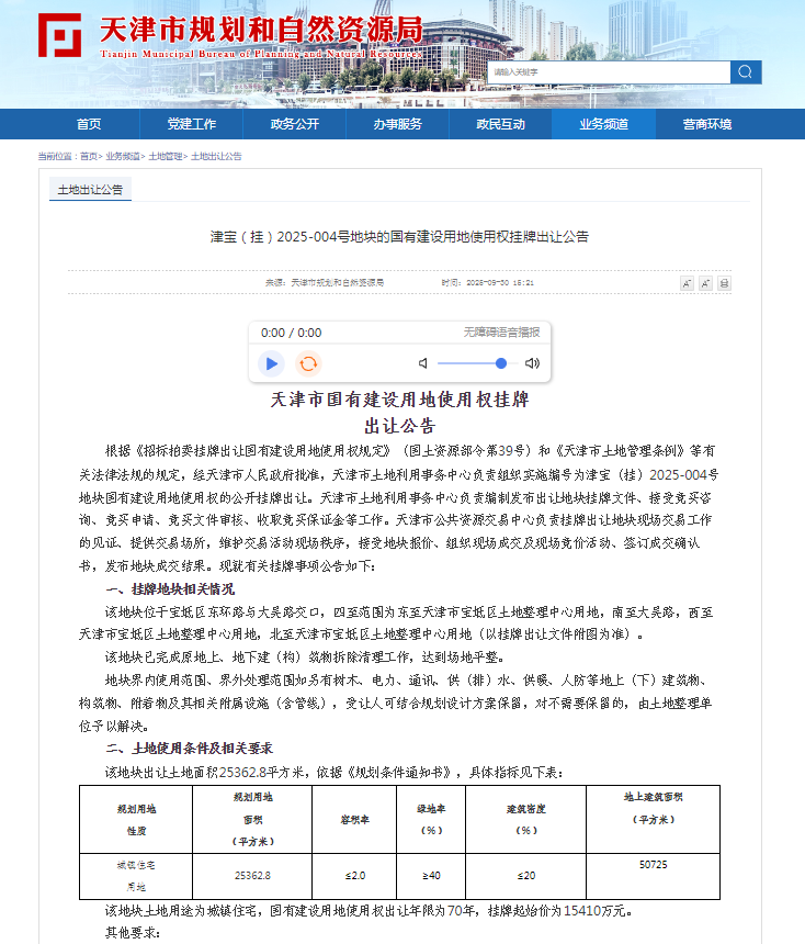 由3变4!天津10月待摘牌宅地又多了一宗——津宝(挂)2025-004号宗地,位于宝坻城北、东环路与大吴路交口,临近宝坻一中,刚刚挂牌上架。地块占地25362.8平米,容积率2.0,规划建面50725平米,挂牌起始价15410万元,折合起始楼面价3038元/平米。预计10月30日上午9:30摘牌。这也是今年宝坻出让的第二宗地,上一宗为瑞赛投资底价摘得的宝坻城南地块,成交楼面价4050元/平米。
