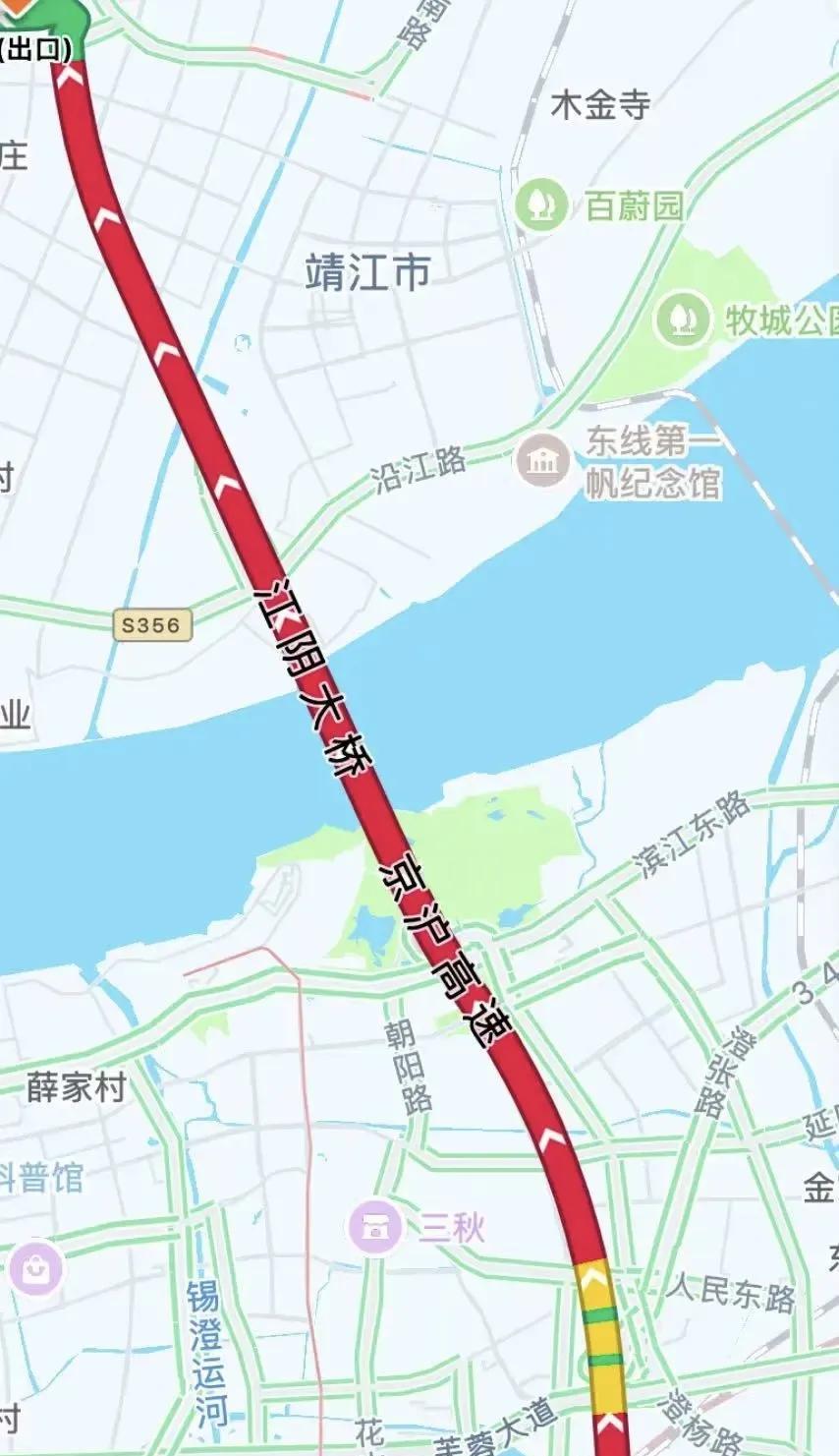 此刻,江阴大桥:导航显示江阴大桥往北京方向大流量缓行到广陵枢纽已经堵成了红色。(相关信息和图片来源于江阴发布)