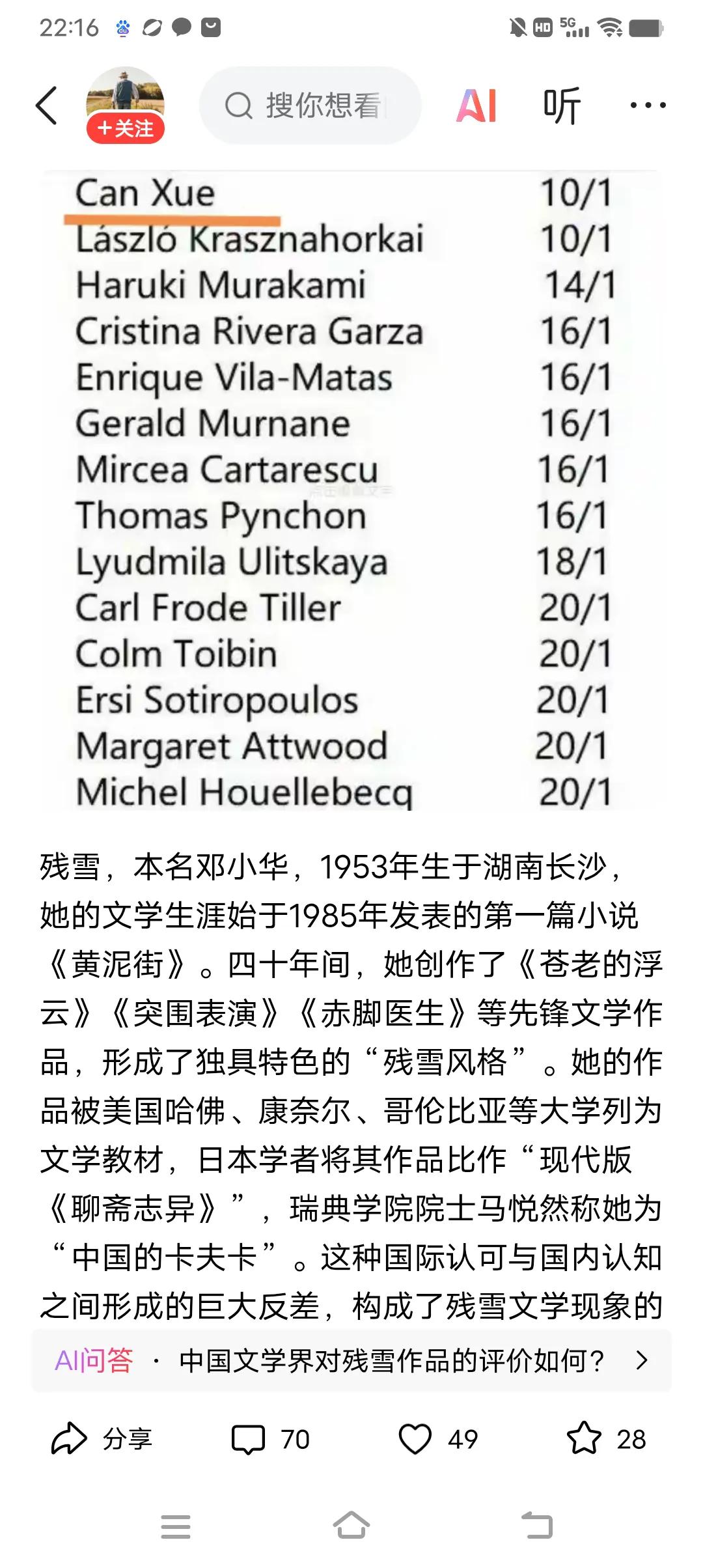 去年诺贝尔文学奖残雪的呼声就很高,希望她今年能获奖。很多网友说她写的文章看不太懂