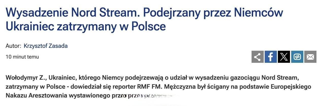 2022年德国北溪管道袭击案件的第二名乌克兰袭击者弗拉基米尔·Z确认在波兰境内落网,未来他将被引渡去德国接受审判。
