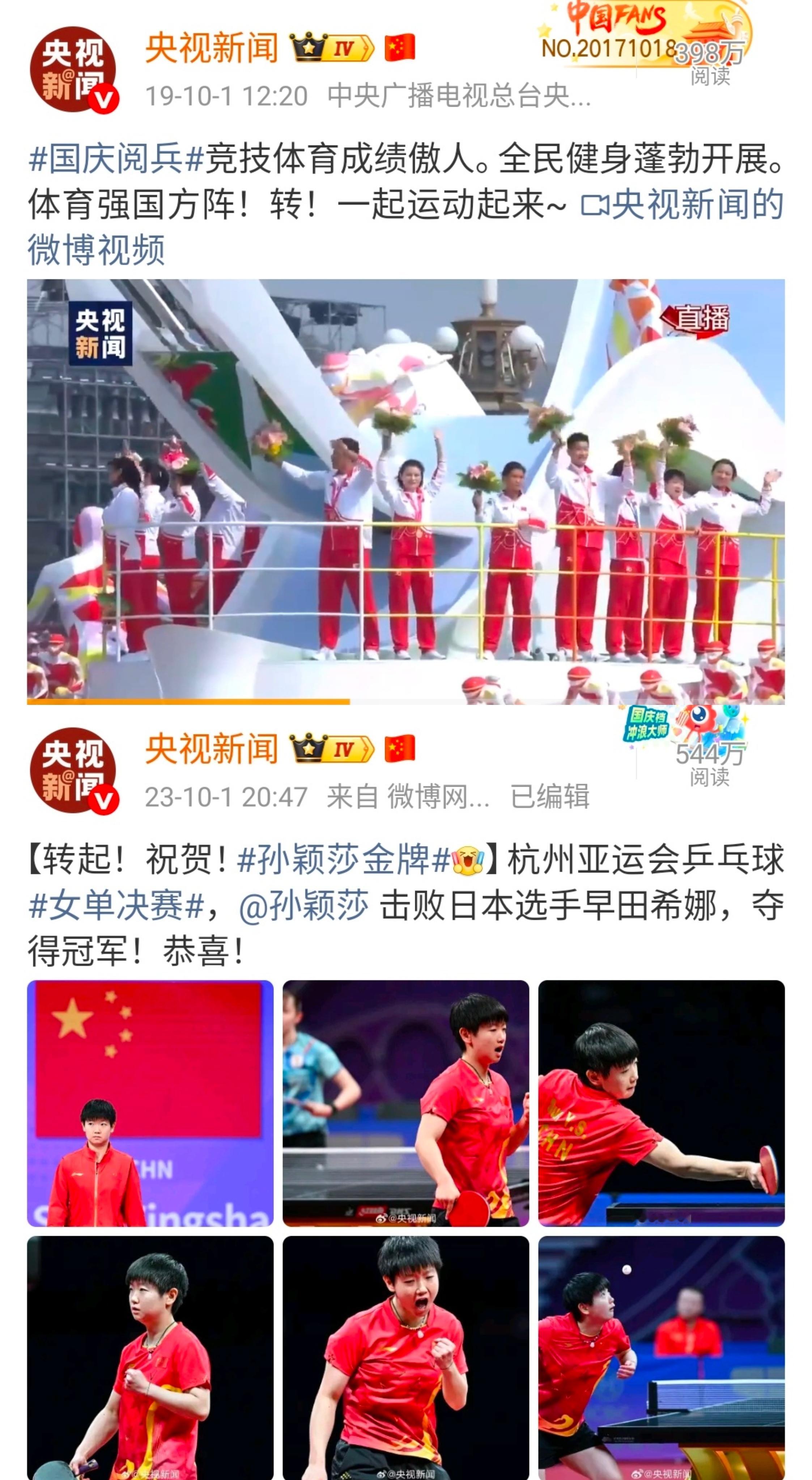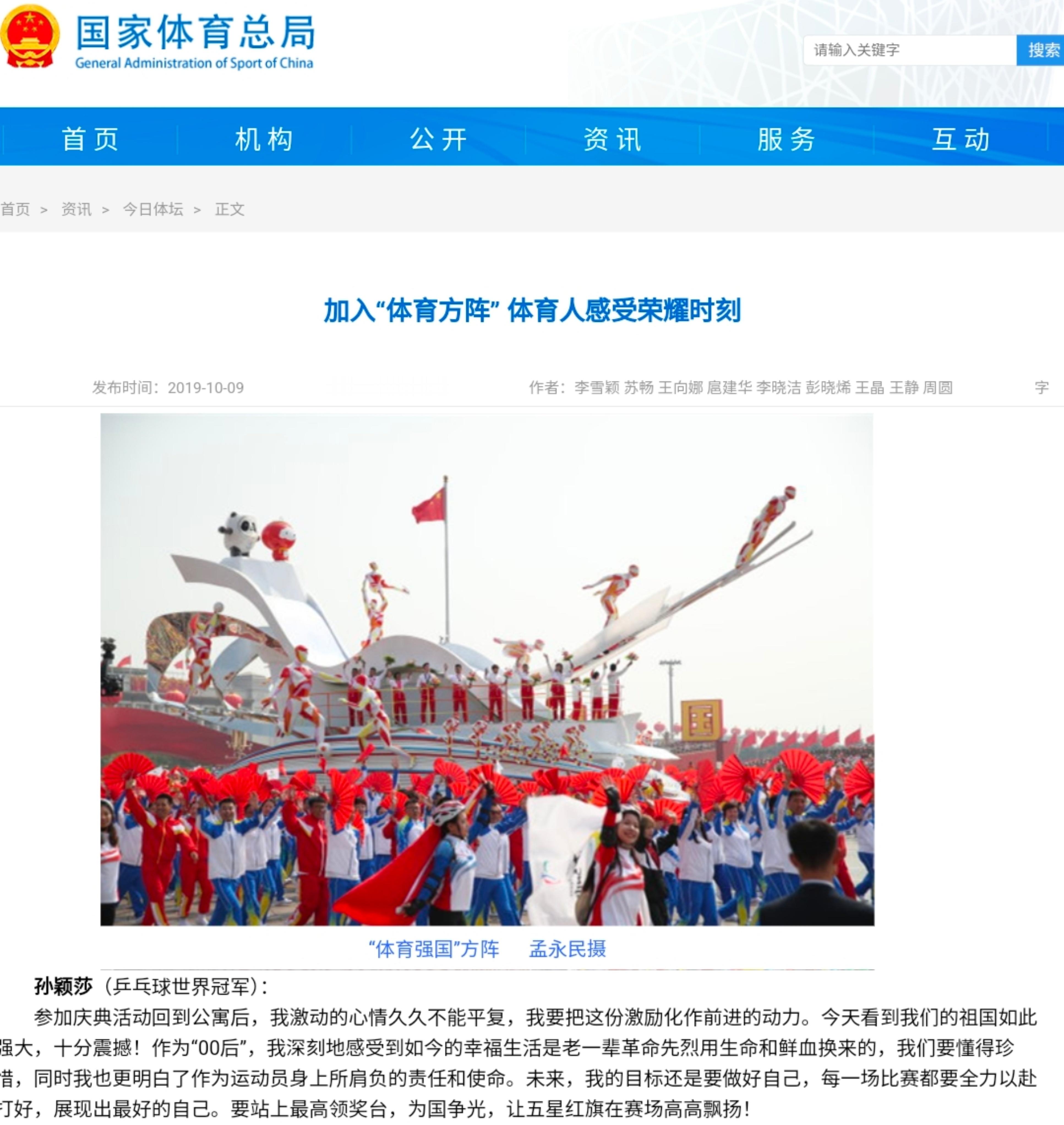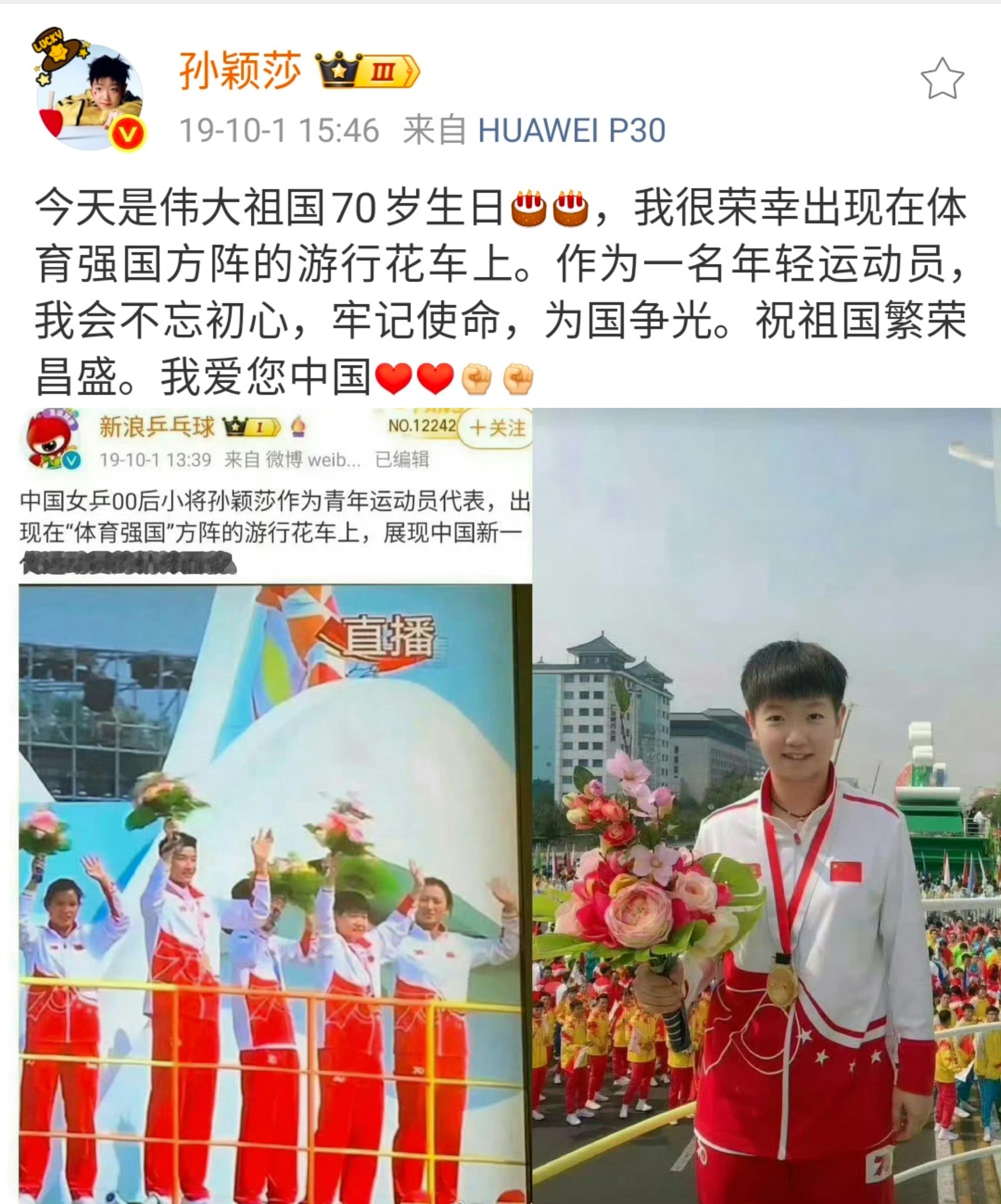 2019年国庆七十周年大阅兵,00后小将孙颖莎作为青年运动员代表,出现在“体育强国”方阵的游行花车上,展现中国新一代运动员的精神面貌。