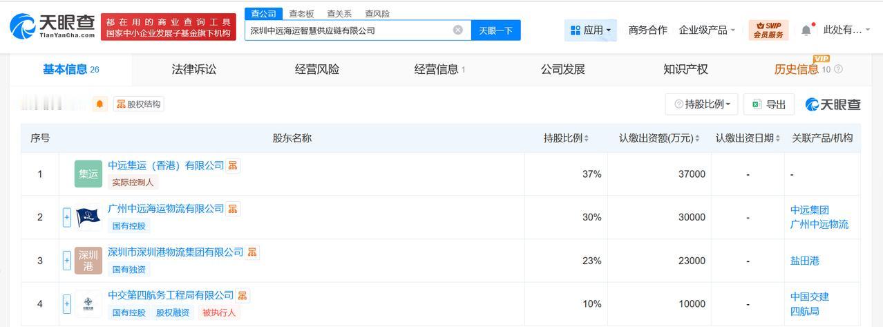 中远海运等在深圳成立智慧供应链公司注册资本10亿 天眼查App显示,近日,深圳中