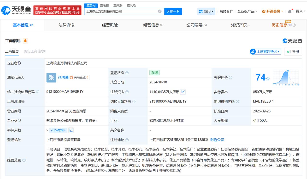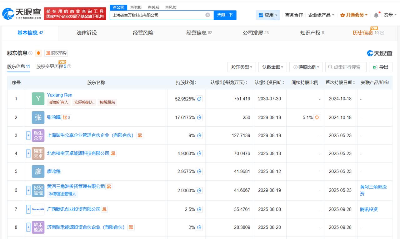 腾讯等入股碳生万物科技公司 天眼查App显示,近日,上海碳生万物科技有限公司发生工商变更,新增广西腾讯创业投资有限公司、济南碳禾能源投资合伙企业(有限合伙)、宁波碳维新能源科技有限公司为股东,注册资本由约1277万人民币增至约1419万人民币,同时多位高管发生变更。 该公司成立于2024年10月,法定代表人为张鸿曦,经营范围包括信息系统集成服务、企业管理咨询、社会经济咨询服务等,现由Yuxiang Ren、张鸿曦及上述新增股东等共同持股。公开资料显示,该公司聚焦碳科技与新材料领域创新应用,致力于为化工、能源行业提供清洁技术解决方案。 天眼查信息: