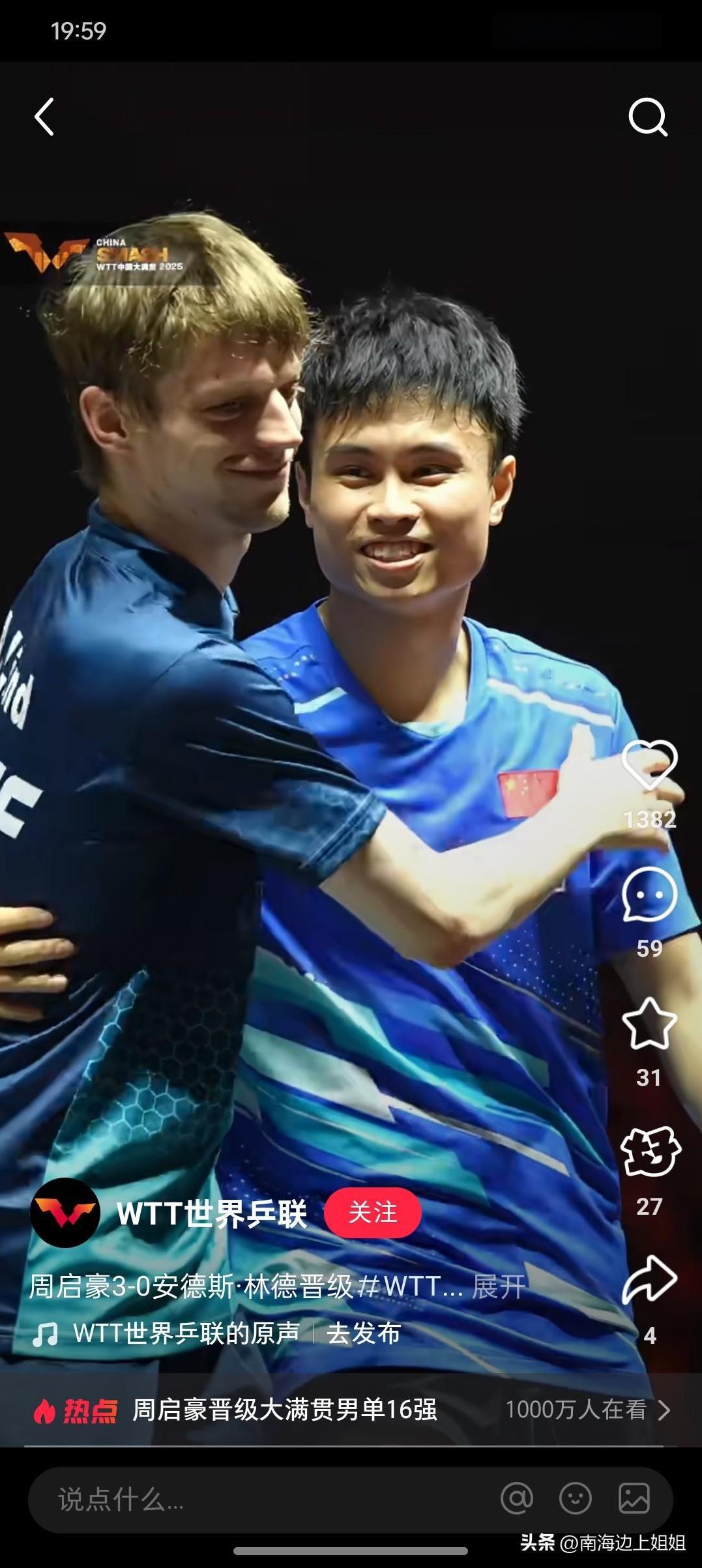 今天周启豪满电,3:0战胜林德! 林德以第一个发球和最后一个发球都失误,结束了这场比赛。 “ 满电”的口号产自厦门的乒超,周启豪喜欢“满电”这个加油声,采访时一度感动得哽咽,热血永远年青!加油吧!