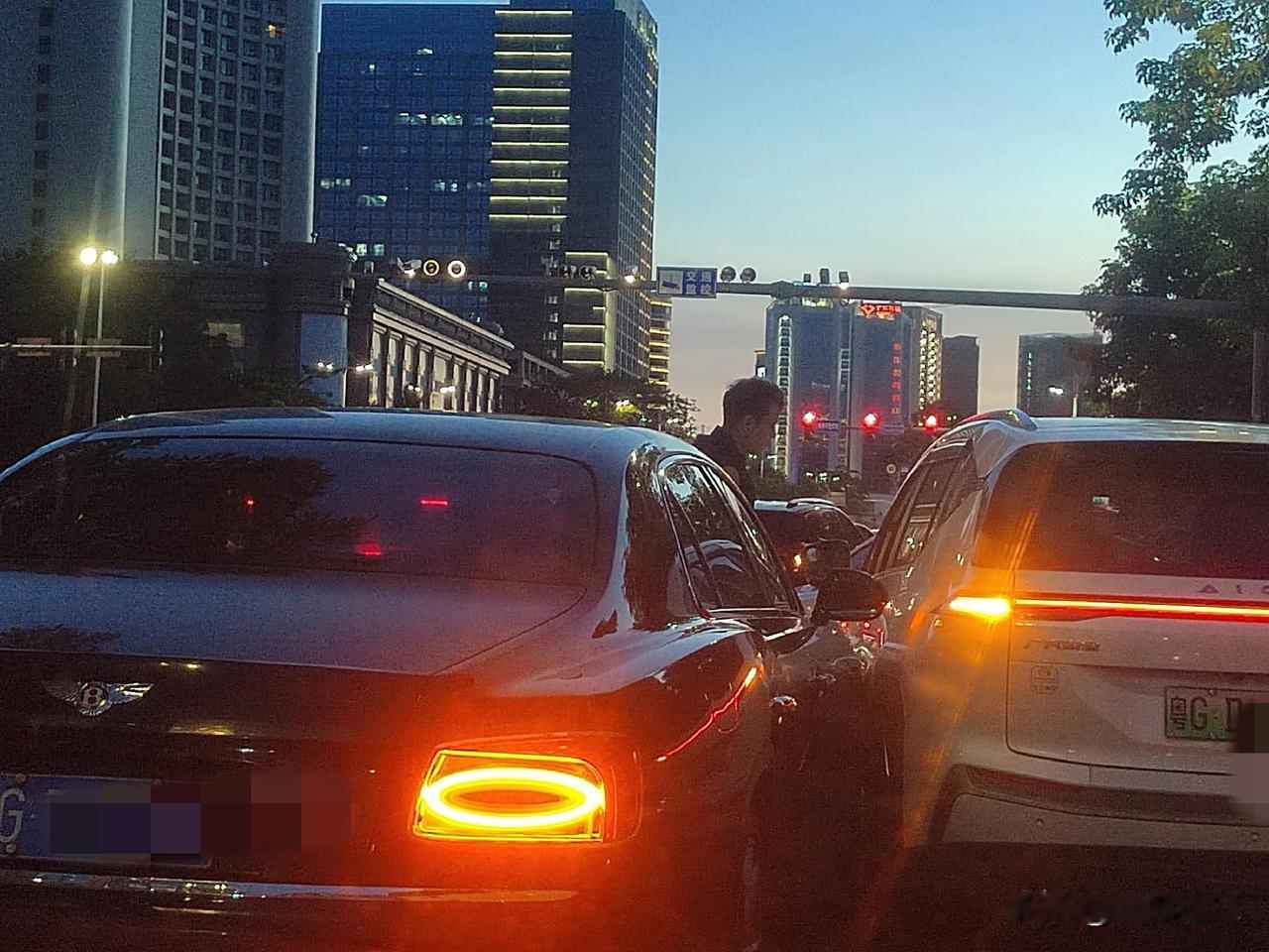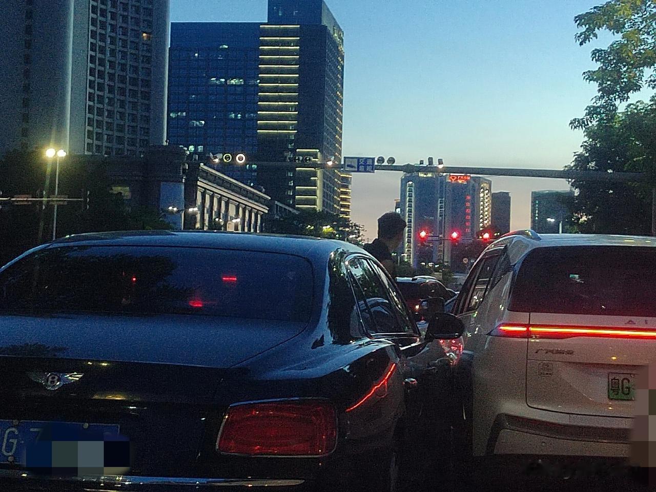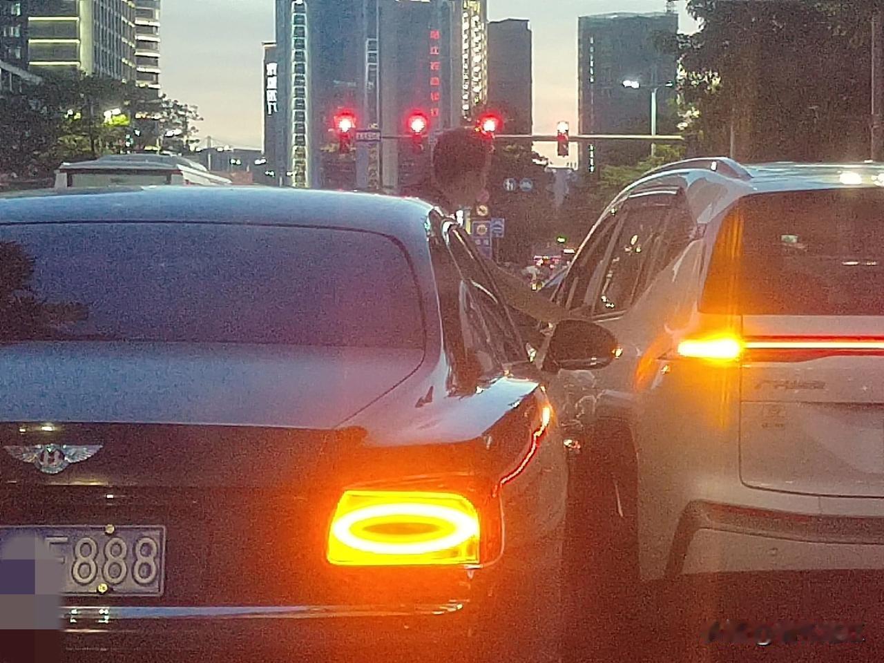 9月30日傍晚,在湛江经开区君豪酒店对面的乐山路,一辆宾利与一辆广汽埃安亲密接触