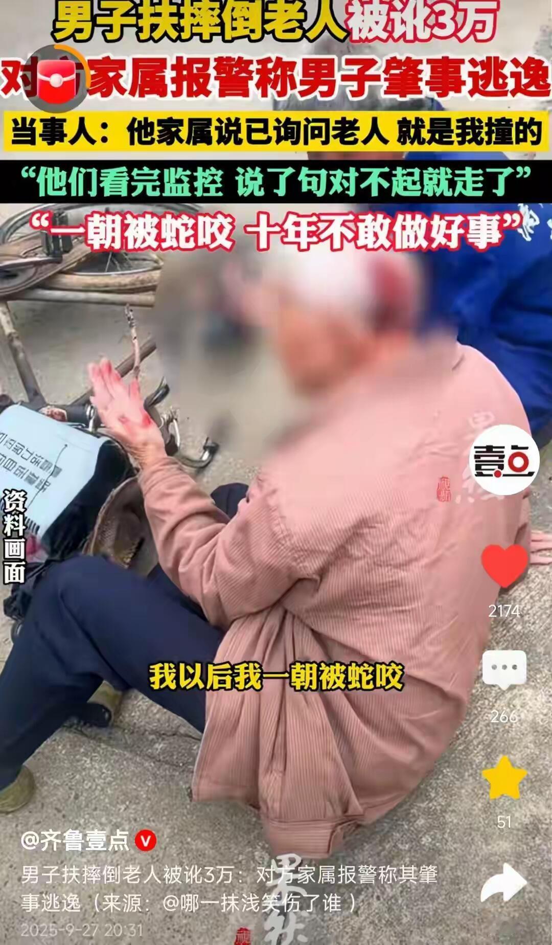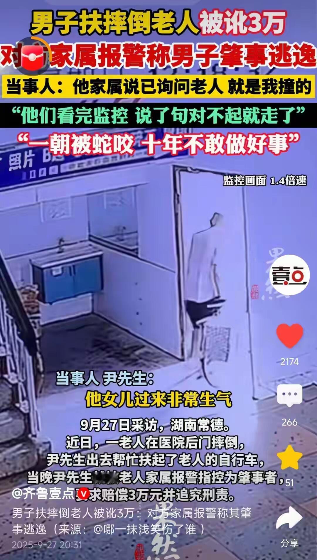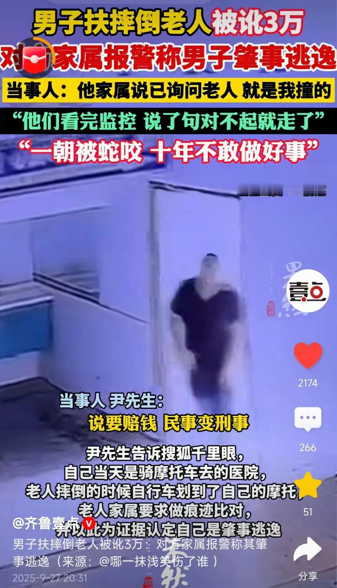 这事真让人寒心。尹先生在医院后门听到“砰”的一声,看到一位老人连人带车摔倒。他出于本能上前扶起自行车,没想到当晚就被老人家属报警,指称他“肇事逃逸”,还索要3万元赔偿,并威胁追究刑事责任。 关键证据是他摩托车上的一道划痕。在监控盲区的情况下,尹先生百口莫辩。幸运的是,他后来找到了一个朝向室内的摄像头,拍到了事发经过:老人是自己摔倒的,尹先生是事后上前帮忙的。真相大白后,对方家属只丢下一句“对不起”就走了。 一句“对不起”,真的能抵消差点被毁的清誉和无端的恐惧吗?如果没有那个摄像头,尹先生的人生可能就此改写。 这起事件反映出的问题令人深思: - 诬陷成本太低:随口一句“是他撞的”,就能把一个好人拖进泥潭。 - 取证意识不足:在监控盲区,个人更要懂得主动留痕。 - 社会信任受损:当善意可能换来麻烦,愿意伸出援手的人就会越来越少。 遇到类似情况,我们该怎么办? 1. 先确认安全:检查伤者状况,必要时立即拨打120。 2. 立即报警:让警方介入,这是最有力的保护。 3. 主动取证: - 用手机拍摄现场环境、伤者位置、自己车辆情况。 - 寻找目击者,记下联系方式。 - 查看并申请调取周边监控。 4. 救助有度:在不具备专业知识的情况下,不要随意搬动伤者,避免造成二次伤害。 希望尹先生的遭遇能推动相关制度的完善,比如设立“善意救助免责”和“恶意诬陷追责”的明确机制,让好人不再难做。 你觉得应该如何从制度上保护好人,惩戒恶意诬陷者?欢迎在评论区聊聊。
