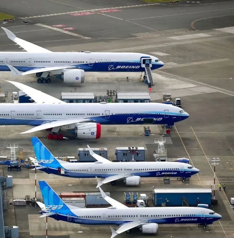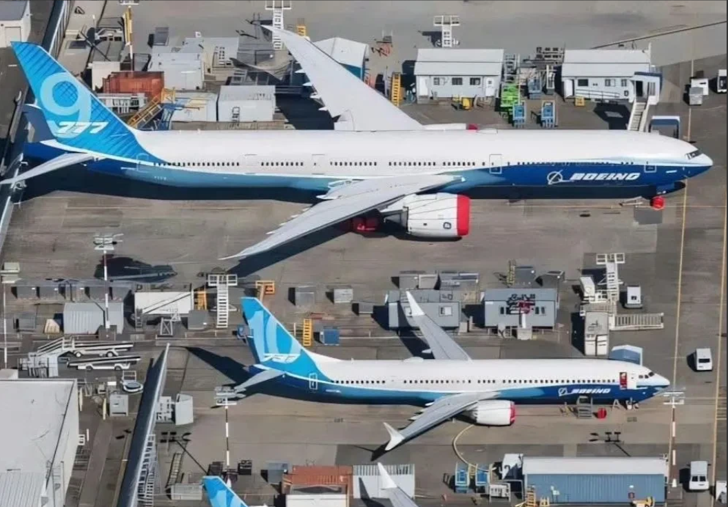 同样是双发客机,体格差距是极为惊人的。光是波音777使用的GE9X涡扇发动机的进气口直径(3.4米)就超过了波音737的机身直径,其体格已经接近四发动机的747了。宽体客机的客舱也巨能装,可以并排安置九列座位。