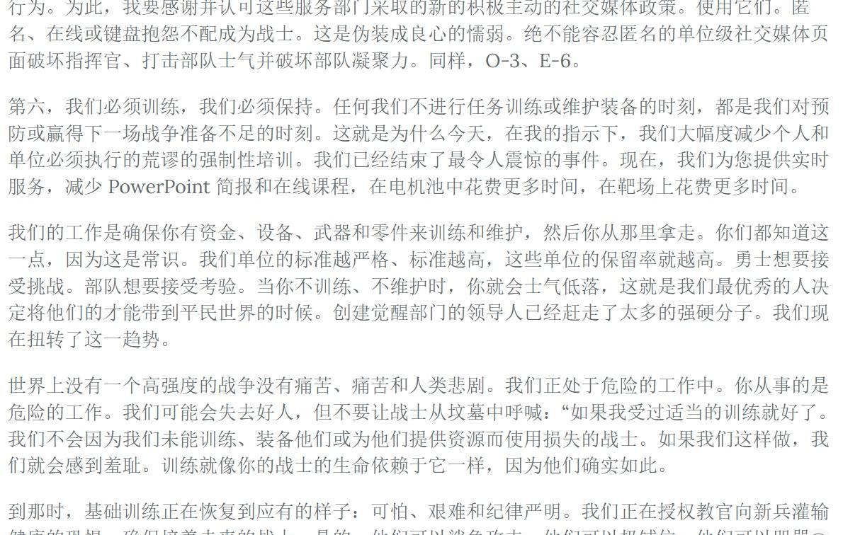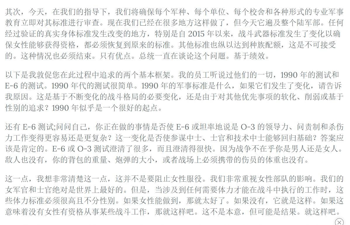 【想嘲笑、扭曲、空洞化美军全球将领大会?最好先看看美国防长演讲内容!】 美防长赫格塞斯发言要点: 1、军队不要空喊“政治正确”的口号,政治是政客和政府的事,军人的职责就是搞好战备训练和打赢战争。 2、要把时间和精力放在训练场的训练上,大幅度削减PPT汇报和在线培训。 3、彻底解决不担责问题,美军不需要墨守陈规的庸才,而需要敢于探索的人才;要彻底解决纪律审查“武器化”的问题,不能允许把纪律审查当成打击异己和政人的工具显现继续存在;要彻底解决对“有问题”军人的使用问题,不能因为有问题或小问题就彻底否定一个人,要建立容错机制。 4、我解雇了参联会主席等一些高级指挥官,因为他们本身就是禁锢美军发展的问题所在,所以不能用他们来解决现在需要解决的问题。 5、美军必须保持体能,每年进行两次测试;必须保持体型,向“肥胖军队”宣战;必须保持军容风纪,不能留长发、蓄胡子,不管什么民族和种族;必须保持性取向正常,绝不容“穿裙子的男人”。 6、必须对战斗力标准进行重新审查,不能用30年前的标准指导今天的实践。战斗力标准只有一个,对男女一视同仁,如果女人能够达到,是好事,如果达不到,就不能继续留在部队。 7、晋升的渠道只有一个,就是功绩,绝对容许有任何的歪门邪道。