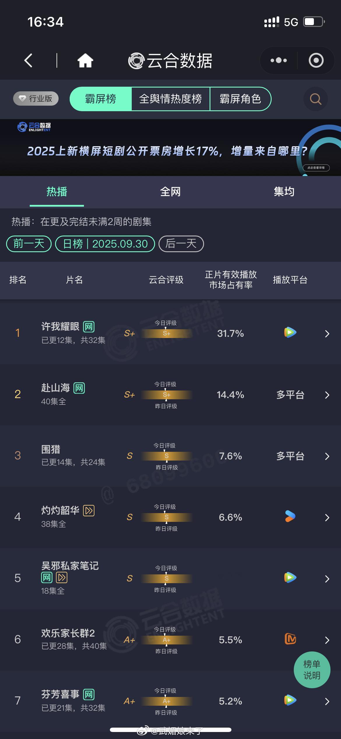 赵露思、陈伟霆《许我耀眼》云合突破30%了,单平台5天就过30%,太恐怖了[期待]