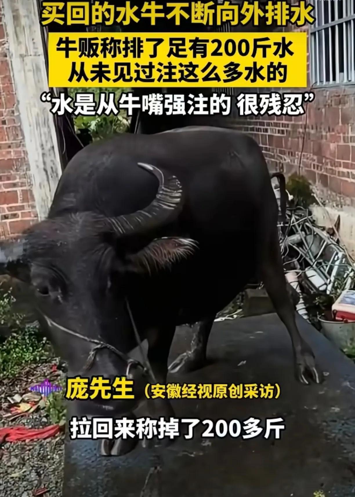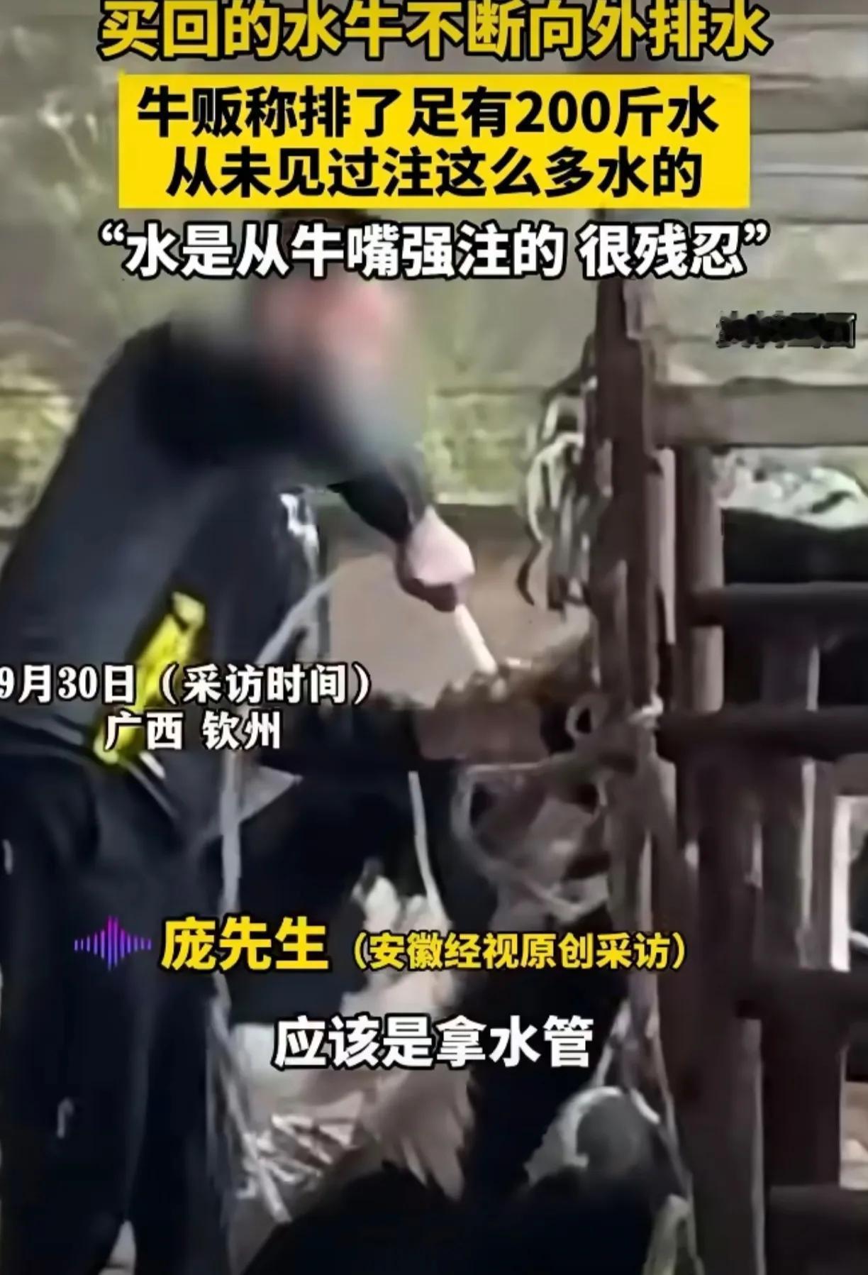 有些人真是残忍啊。广州钦州一大哥买了一头水牛回家。到家后,发现牛不断的往外排水,站都站不稳。最后上称,发现牛足足排了大约200斤水。 真想不到这些人怎么下得去手,为了钱竟然往牛嘴里强行灌注这么多水,真是一点怜悯之心都没有。真是印证了无奸不商,为了利益,已经不配为人了。人性 社会百态 动物