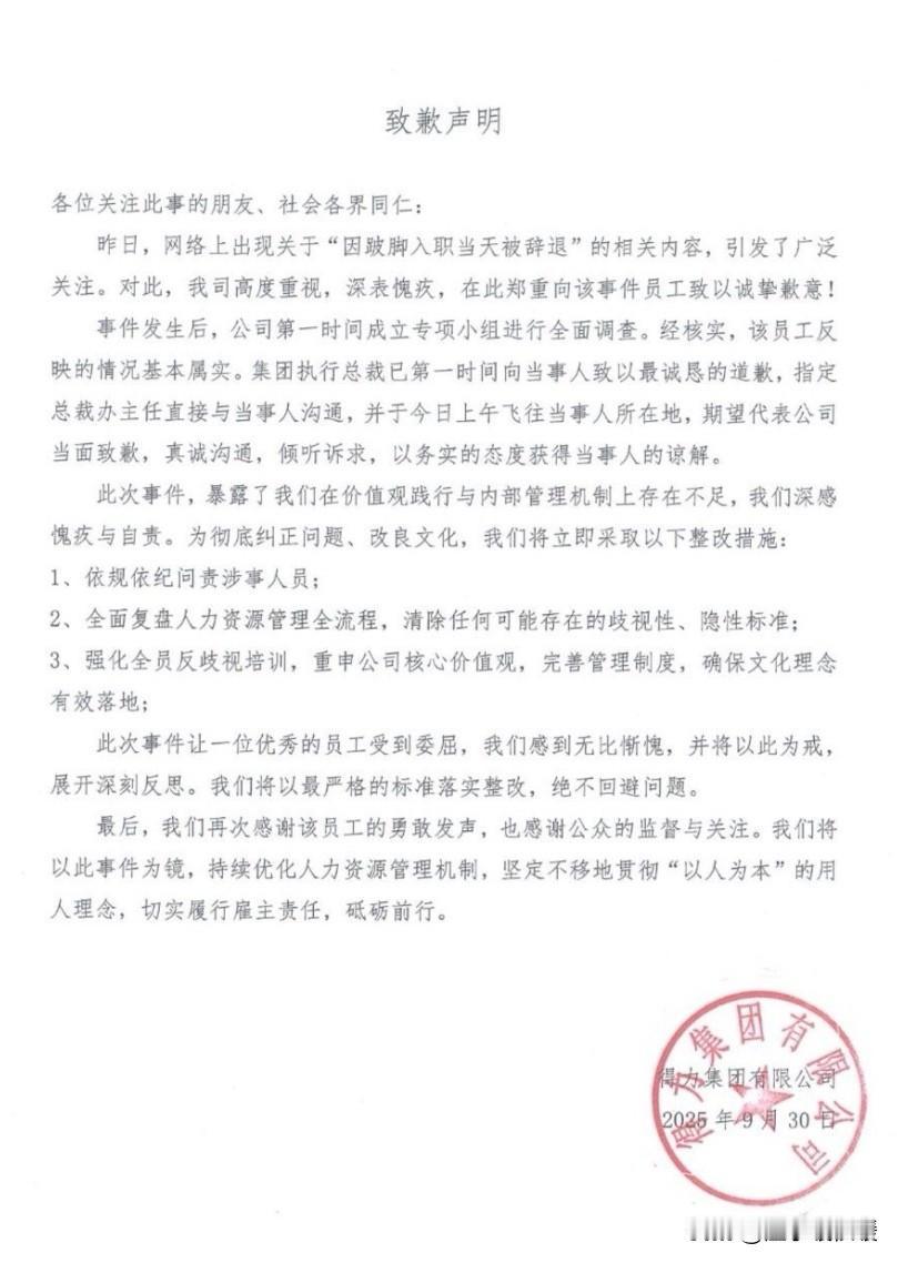 😲 一位跛脚女孩的故事引发全网关注!她通过得力三轮面试,却在入职当天因腿部残疾被辞退。女孩表示自己有7年工作经验,腿部问题不影响工作,却仍被要求“主动离开”。 💪 面对得力CEO的亲自道歉和重新入职邀请,女孩展现了惊人骨气:“我不是非得力不可!” 她婉拒了得力,选择继续前行。这种不妥协的勇气,让我们看到了职场中最珍贵的尊严! 🌈 姑娘,你的坚持比任何工作都珍贵!人生的道路不会因一次挫折而停滞,你的勇敢已经激励了无数人。愿你前程似锦,在更适合的舞台上绽放光芒! --- 数据消息来源:界面新闻、闪电新闻、凤凰新闻、百度百科 得力集团辞退跛脚员工 得力集团就跛脚员工入职被辞退致歉