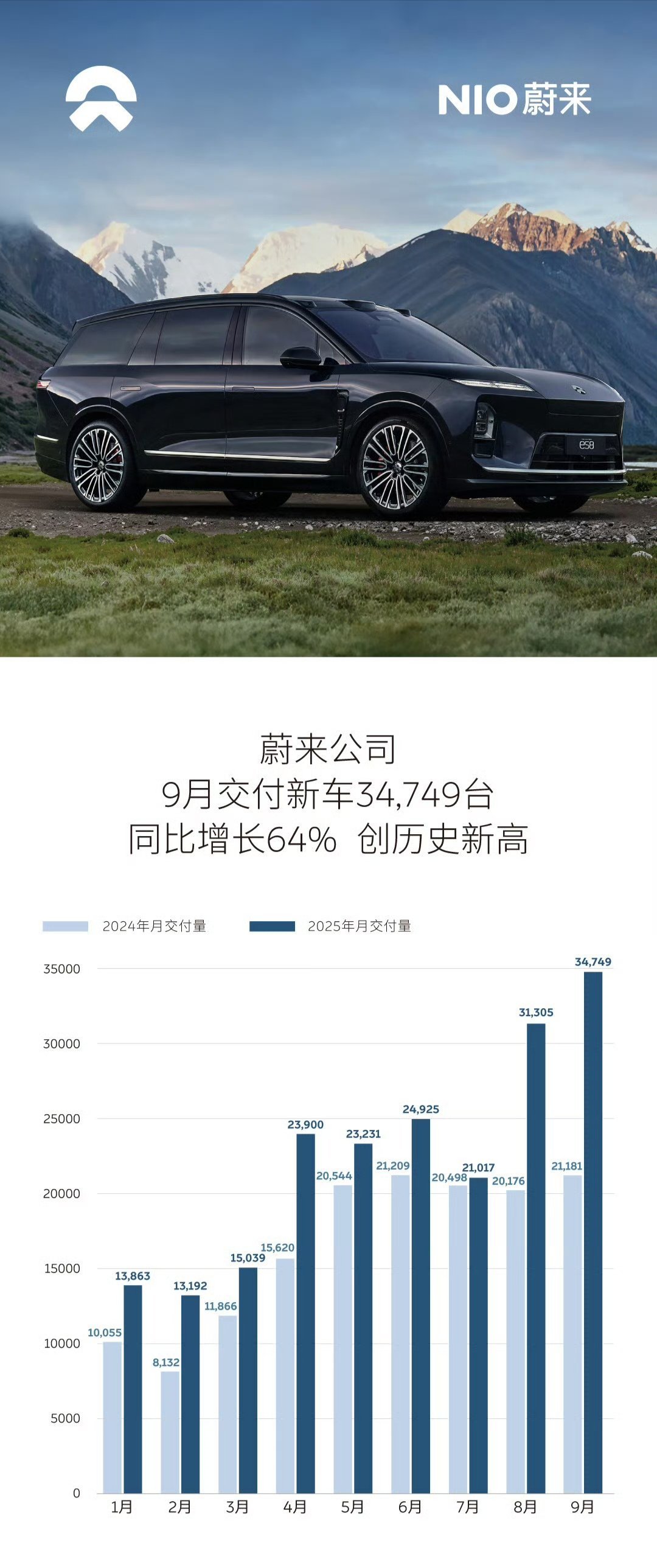 蔚来9月份的成绩单,34749台,也是好起来了,历史新高。新的ES8应该销量也挺不错的,毕竟这一代性价比也是很高的。