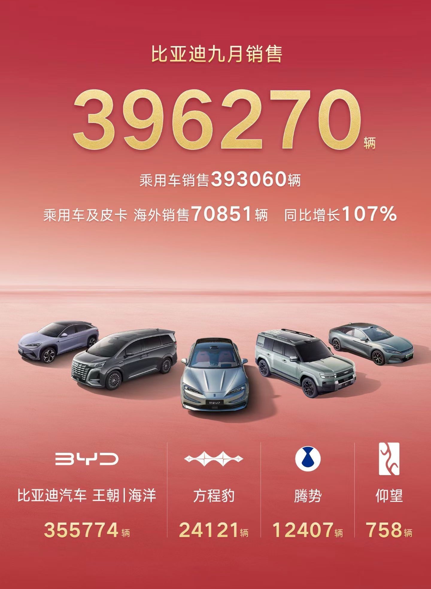 日前,比亚迪官宣:今年前9个月,累计销量超326万辆,海外销量超70万辆。其中,9月份销量达39.62万辆,海外销售7.08万辆,同比增长107%。具体来看,比亚迪王朝丨海洋单月销量达35.57万辆,方程豹单月销量达2.41万辆,腾势单月销量达1.24万辆,仰望单月销量达758辆。