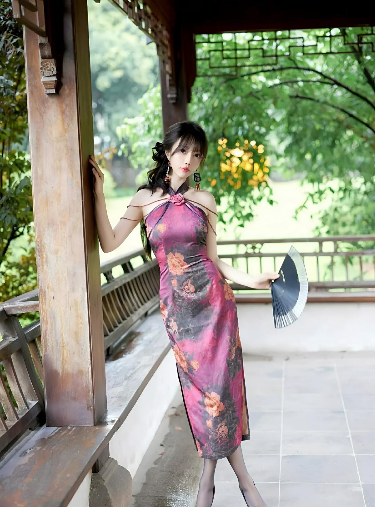 玥儿玥er旗袍大片:玫红牡丹纹样旗袍尽显优雅,折扇轻摇间浅藏国风浪漫