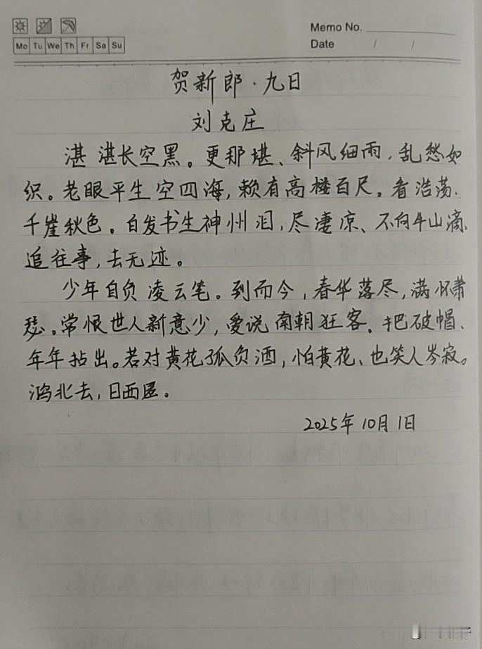 抄书第 961天(2025年10月1日) 静心✔ 戒浮躁,一笔一划。 今天继续抄《唐诗宋词三百首》之《贺新郎·九日》,这是南宋词人刘克庄的一首重阳节登高抒怀之词。宋词三百首历来与唐诗并称双绝,都代表一代文学之盛。 词人由凄凉的天气联想到自己报国无门的苦闷,于是借景抒情,全词写景寓情,叙事感怀,以议论为主,借题发挥,感慨苍凉。
