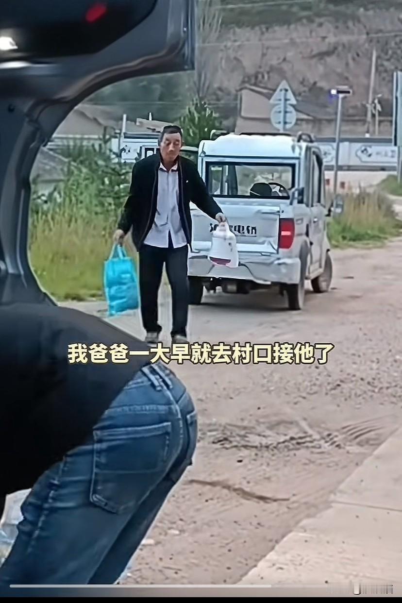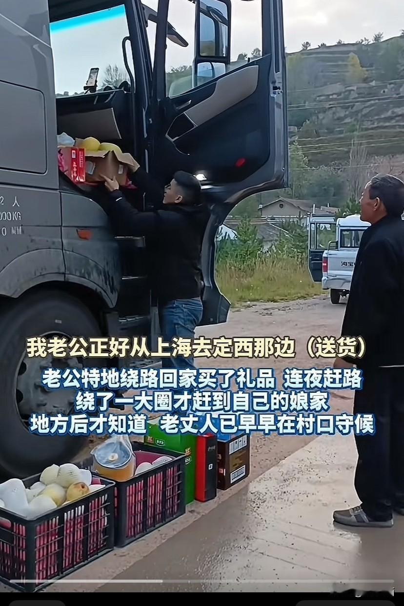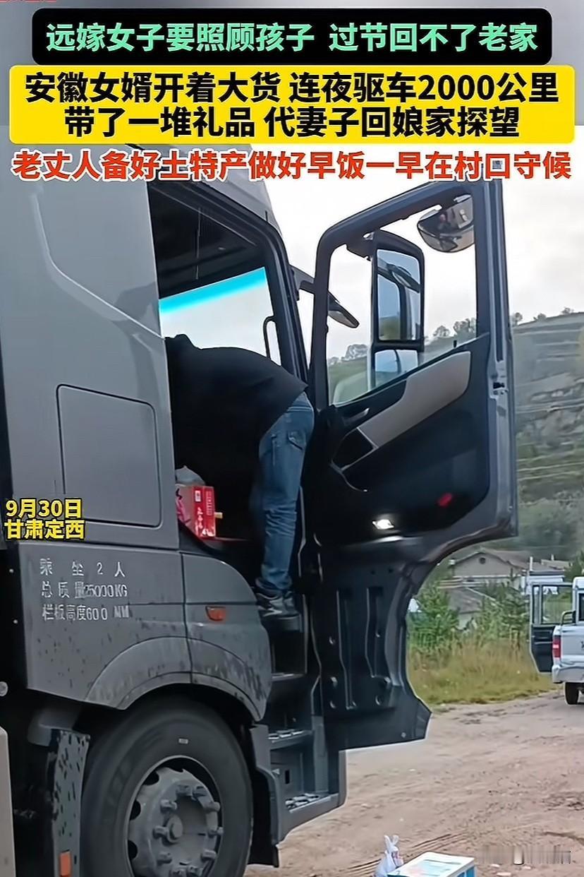 甘肃定西,远嫁女子因要照顾孩子,过节无法回去娘家看父母。安徽女婿开着大货车连夜驱车2000公里,带上一堆礼物代妻子看望老人。老丈人一早备好早饭还带上土特产在村口等女婿。 张女士说:结婚有了孩子后,我和丈夫分工合作,他主外我主内。因为我是远嫁,平时也很少回去娘家,这次国庆放假,我本想回去甘肃看一看父母,顺便陪他们过中秋节。 可是,孩子还要上学,我得在家里照顾他,没办法回去娘家。和丈夫聊天时,我把自己的想法告诉了他。 丈夫安慰我说:辛苦你了,媳妇。我这趟货是从上海送到定西,虽然离老丈人家有点远,但是我可以绕路去看看他们。 于是,张女士和丈夫商量,她继续在家里照顾好孩子。丈夫从上海开车过来时回家一趟,带上安徽的特产砀山梨,再买上一些礼物代表自己去看望老人家。 为了不耽误送货时间,张女士给娘家人打电话告诉他们女婿带来过节礼物。让老父亲早上到村口等女婿。 这边的女婿回家拿了家乡的特产后,又特意绕路买好礼物,然后连夜开车2000公里,在第二天一早赶到老丈人的村口。 而老丈人也早早的等在村口,老人看到女婿后很开心,并交代他开车注意安全,还贴心的为女婿带来早餐和家乡特产。 虽然女婿和老丈人这次见面的时间不长,两人也随意的说了几句话。可是,这几句话饱含对亲人的牵挂。
