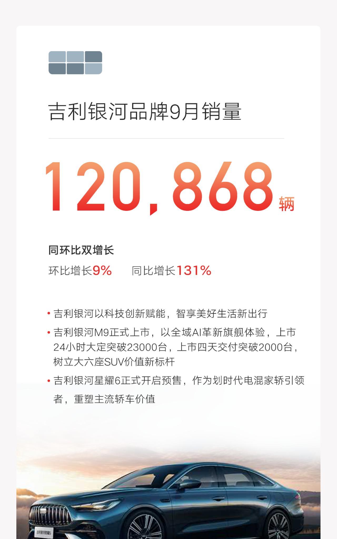 吉利汽车9月销量27.3万辆,新能源车占比60% 也就是说还有40%的车是燃油车 明年新能源车购置税优惠力度减半,对燃油车是个短暂利好 燃油车也很重要 具体来看品牌 吉利银河:12万辆,同比增长131% 领克:3.29万辆,同比增长28% 极氪:1.8万辆,环比增长4% 最后海外出口量:4万辆,环比增长13% 现在吉利还有几个爆款没有完全释放 银河M9,产能还在爬坡 星耀6,对标比亚迪秦PLUS DM-i,奔驰AMG前脸 另外几款银河的车也都卖得不错 领克这边,900发挥非常稳定,一个月6000+ 极氪,9X刚发布,年底001、007这些车型改款 今年4季度和明年,都是吉利的爆发时刻 看什么时候销量能追上比亚迪了【来自懂车帝车友圈】