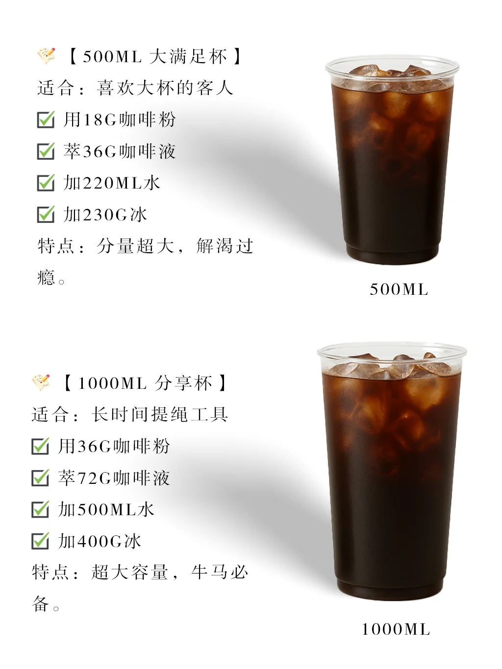 1000毫升装美式,喝的时间会比较长,如果需要确保口感全程教佳的状态,需要让顾客加💰,然后加入3份浓缩咖啡。