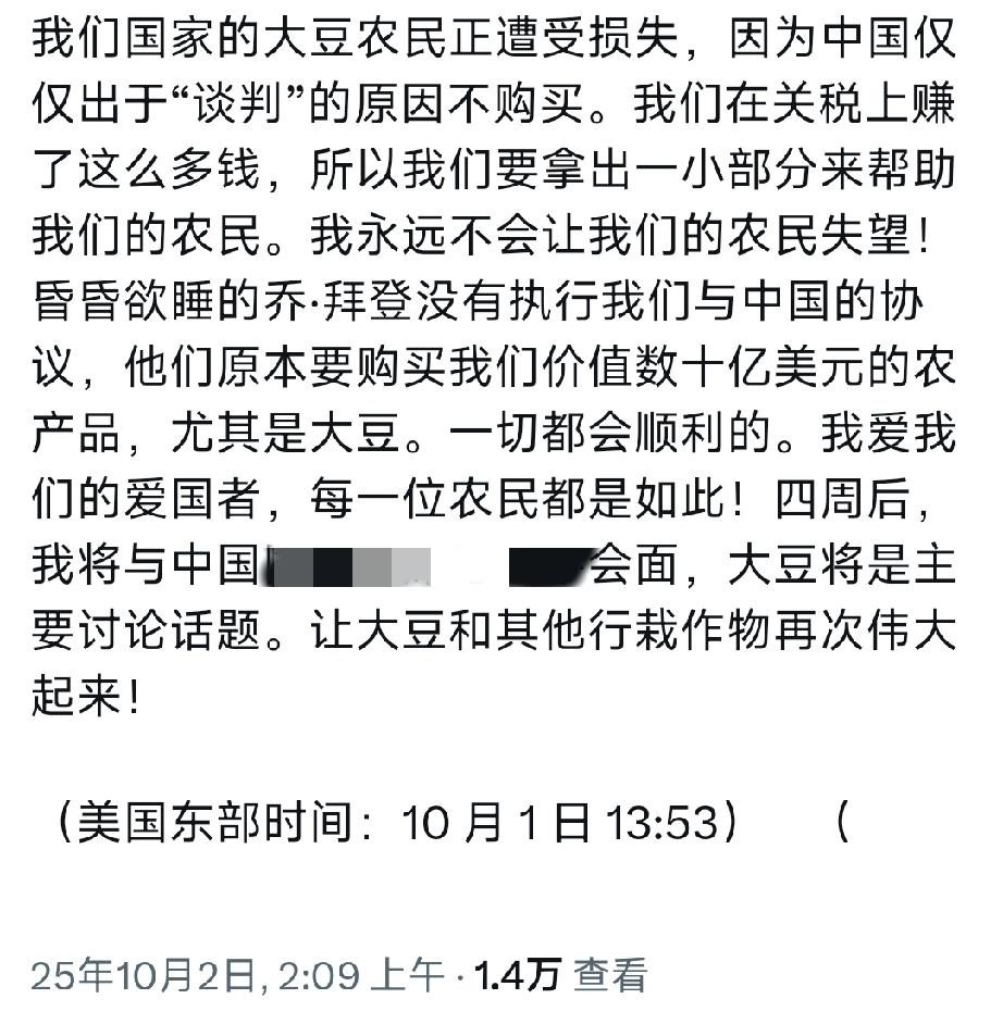 10月2号,特朗普发文预告了中、美之间的线下见面时间,并且直接点名这一次会晤的重点将是“大豆”。那么如何看待特朗普的这个表态呢?大豆问题又能否得到解决呢? 首先,特朗普在他的这条发文当中强调了两点。一方面他批评了中国对美国的大豆政策,强调中方出于谈判的原因,不愿意购买美国大豆。另一方面,他预告在“四周之后”他会与中方举行会见,而他将在会面当中对中方提出采购大豆的要求。 其次,特朗普的这个发文其实已经明确了,中、美双方都会出席月底在韩国召开的APEC峰会,并且举办特朗普第2任期以来的第1次线下见面。不过从特朗普的发言来看,中、美之间对议题的构想可能存在一定差异。中方恐怕希望谈的,是宏观的中、美关系架构,包括关税和台湾等重要且敏感的议题;而美方则将其聚焦于“大豆”,似乎拉低了这场会面的重要性。 第三,美国现在所面临的大豆困难,的确让人感到非常的疑惑。前不久美国与东南亚、日本、韩国、欧洲所签订的贸易协议当中,其实都包括扩大对美国农业产品采购的内容。如今正值美国大豆的集中采购季,这些盟友国家为何不扩大大豆采购呢?为何不履行他们在协议当中的承诺呢?为什么美国依然把大豆采购的责任归咎于中国呢?这其实是非常不合理的。 第四,在美国的压力之下,中、美之间能在大的问题上实现妥协吗?目前来看,难度依然不小。2025年以来,中国的大豆采购已经出现了很大的方向性变化,尤其是转向了巴西和阿根廷。在美国的关税压力之下,巴、阿两国具有极强的价格优势,阿根廷甚至还采取了临时免税的政策。在这样的背景之下,中方没有理由去扩大采购美国大豆。除非美国能在关税等其他重要的问题上做出妥协。 总的来看,特朗普对于大豆的关注,还是由于选举和农业选民所带来的政治压力。中国没有义务去帮助特朗普处理他自己的政治问题,美国也无法“从实力地位的角度”出发,对中国颐指气使。关键在于双方能否照顾到彼此关切的议题,你来我往,互有让步,这才是中、美未来对话和磋商的正确逻辑。