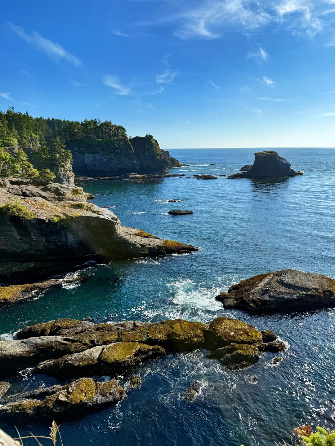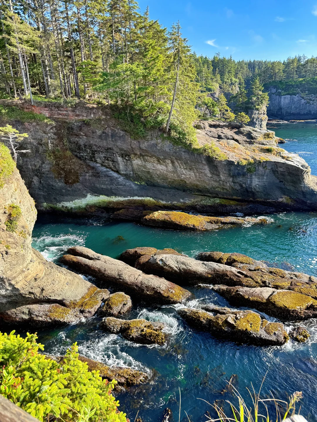 🌊 Trail : 这个Trail是狗狗🐶友好的,整个Trail也不太长,大约0.9英里,整个路线相对平缓,沿途两旁是浓密的绿植,步道的尽头是一片悬崖和海蚀洞。站在悬崖上,能看到蔚蓝的大海,远处的Tatoosh岛和灯塔若隐若现,神秘又美丽。