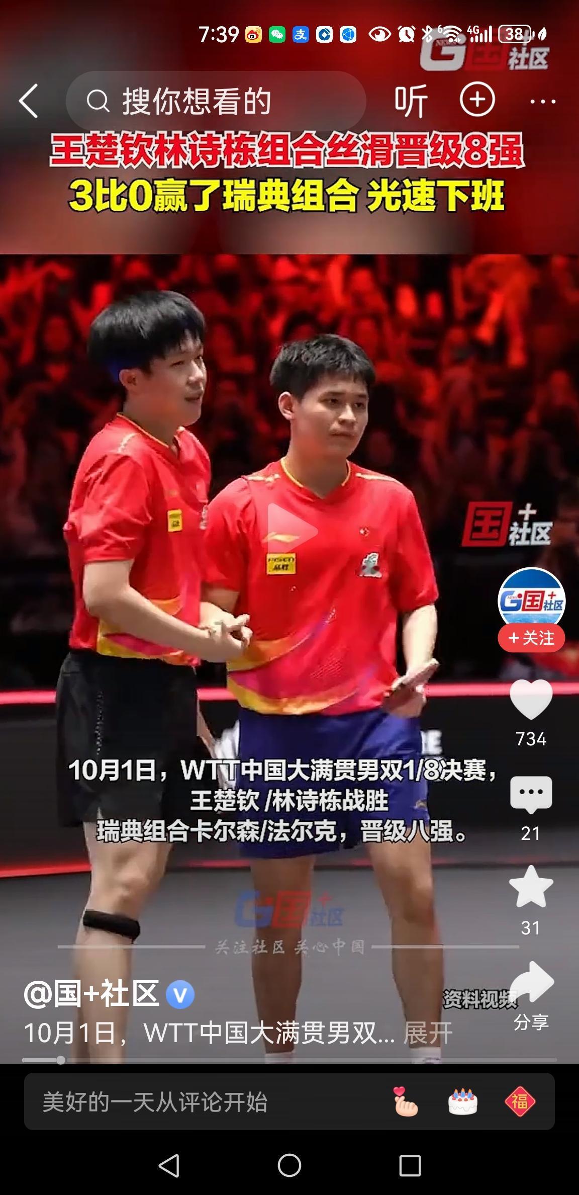 央视表扬王楚钦:一日三战全胜,献给祖国母亲最好的生日礼物 混双晋级:莎头组合对阵蒯曼陈桓宇,3:0取胜,晋级四强 男子单打:王楚钦以3:2击败波兰小将雷德齐姆斯基,晋级十六强。 男子双打:大头和小石头携手战胜瑞典组合,光速下班,丝滑晋级8强 王楚钦,在10月1日这个特殊的日子,以三战全胜的辉煌战绩,不仅仅展现的是个人超强的实战能力和体力,也是为祖国母亲献上的最好的生日礼物。 王楚钦,越战越勇,越来越成熟,真正成为国乒男队赛场上的定海神针! 祝贺王楚钦,勇往直前,无所畏惧,所向披靡,加油![给力][给力]
