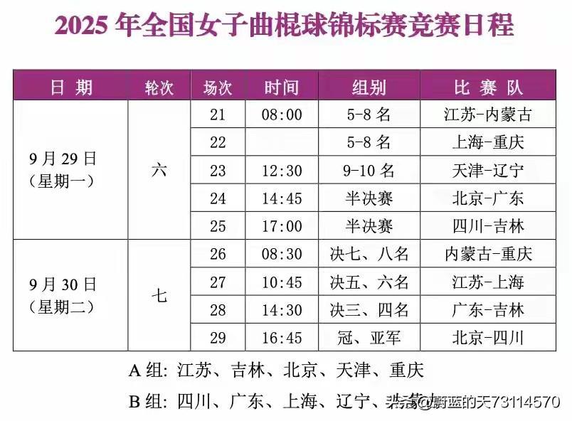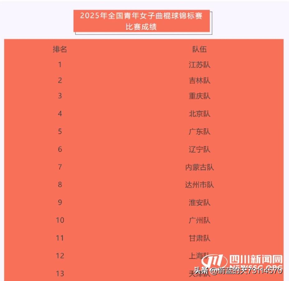 [玫瑰][玫瑰]2025年全国女子曲棍球锦标赛落幕,最终名次产生: 冠 军:四川√ 亚 军:北京 季 军:吉林 第4名:广东√ 第5名:江苏 第6名:上海 第7名:重庆 第8名:内蒙古 第9名:辽宁 第10名:天津 附:2025年全国青年女子曲棍球锦标赛最终成绩: 冠 军:江苏 亚 军:吉林 季 军:重庆 第4名:北京 第5名:广东 第6名:辽宁 第7名:内蒙古 第8名:四川达州 第9名:江苏淮安 第10名:广州 第11名:甘肃 第12名:上海 第13名:天津