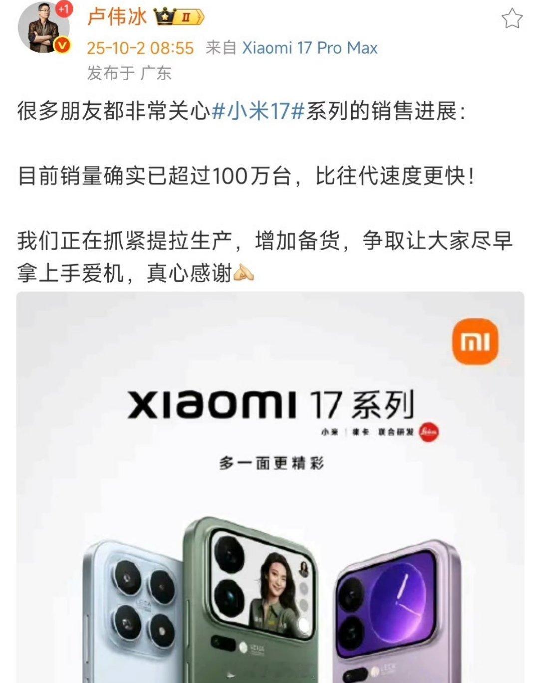 小米17系列销量破100万牛逼! 卢伟冰宣布小米17系列开售5天销量破百万台,其中17Pro Max预计占比过半