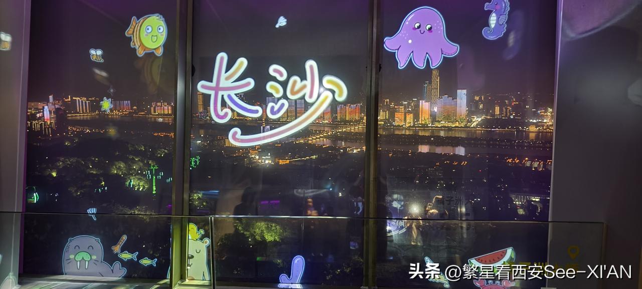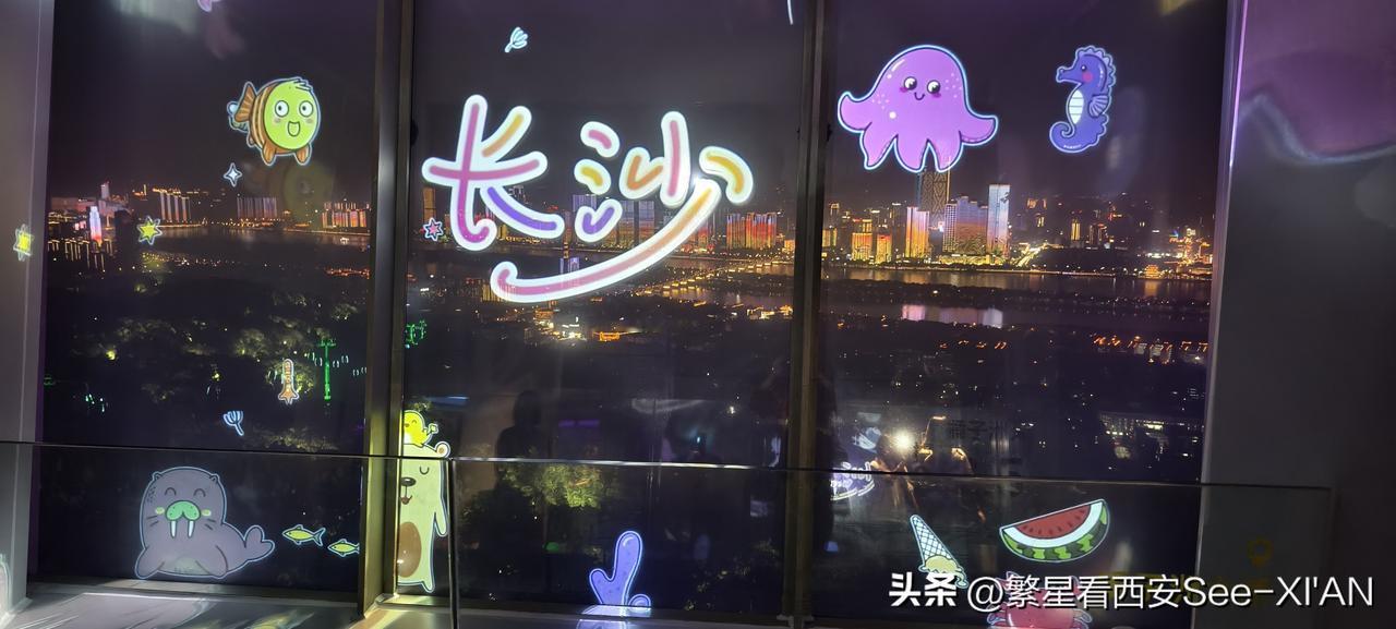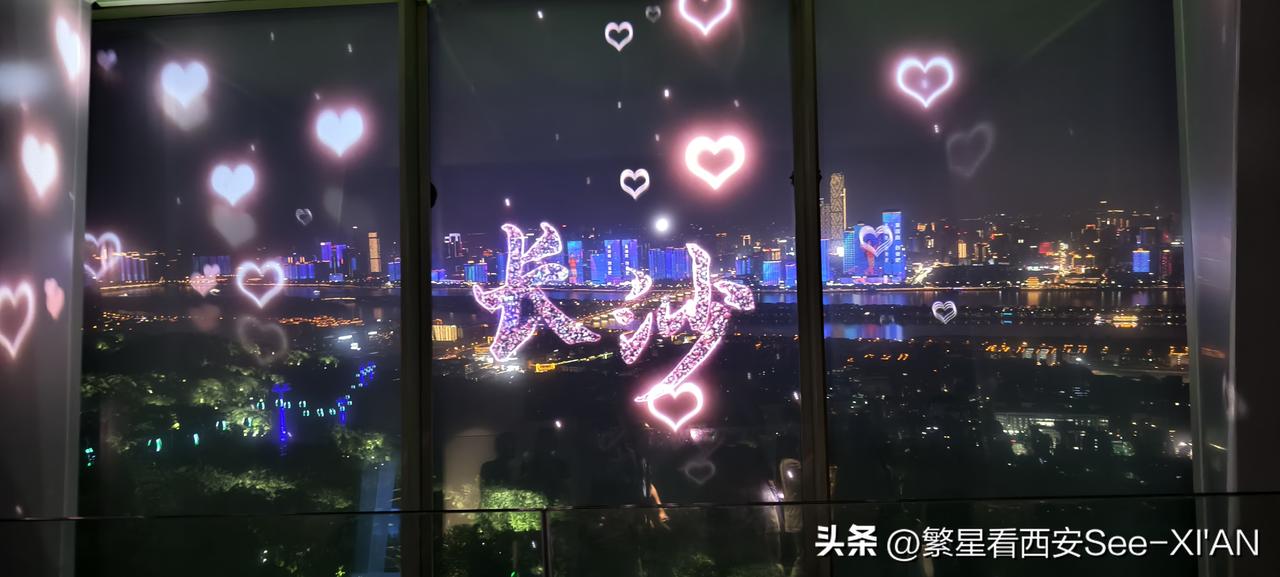 十一当晚,伴着降临的暮色,攀登岳麓山,观摩和感受了长沙之眼(长沙广播电视发射塔),真是眼前一亮。站在塔顶观景区,向下眺望,流光溢彩的夜长沙映入眼帘。看见湘江的柔波,看见穿行的船帆,看见都城的繁华,看见三湘首府“十四五”发展的新成就。值得一提的是,为了配合国庆中秋文旅,特意在这里还设置了“四季长沙”的主题灯光秀。有春叶飘飘、夏花浪漫、树叶飘逸和冬雪飞舞。当沉浸在灯影婆娑与流光溢彩结合的美好仙境中时。突然,仿佛来到了-20摄氏度的东北寒冬,明显看到玻璃“上冻”。不过很快,又升华成水汽,随即一行行极富有心灵治愈的文字进入视野。比如“路还长,别急,好事一定在发芽”,还有“慢一点没关系,我们都在等一个刚刚好的晴天”……。脑海中甚至有了这样的画面感:一个小姑娘,用手在冬天的窗户水汽上写字,最终治愈自己的场景。灯光秀尾声,用浪漫紫的星星小碎片,幻化组合成“长沙”二字,还轻轻摆动。展示出了星城长沙的柔情,动人和精彩。直到灯光秀结束,整个人都还沉浸在刚刚的美轮美奂中。这个长沙之眼绝对值得一去!