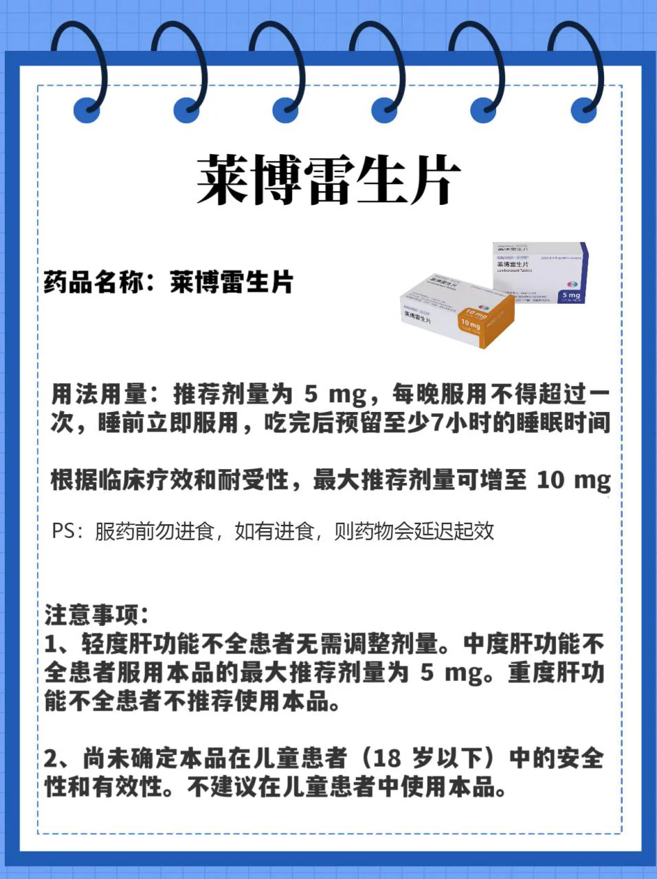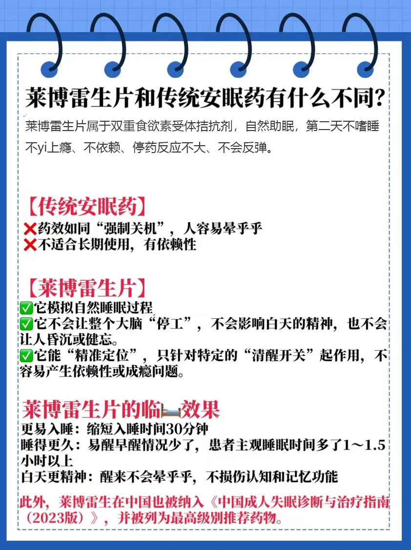 莱博雷生片是国内首款获批上市的双重食欲素受体拮抗剂,通过食欲素控制睡眠相关的神经中枢,自然助眠,优势比较明显:第二天不 嗜睡、不yi上瘾、不会依赖、停药反应不大、不会反弹。