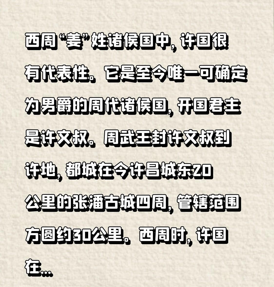 西周“姜”姓诸侯国中,许国很有代表性。它是至今唯一可确定为男爵的周代诸侯国,开国君主是许文叔。周武王封许文叔到许地,都城在今许昌城东20公里的张潘古城四周,管辖范围方圆约30公里。 西周时,许国在稳定环境中发展。东周王权衰落,诸侯争霸,许国厄运来临。它地处中原要冲,只能在强国间周旋,还常遭郑国侵犯,公元前504年第一次亡国,公元前375年彻底灭亡。