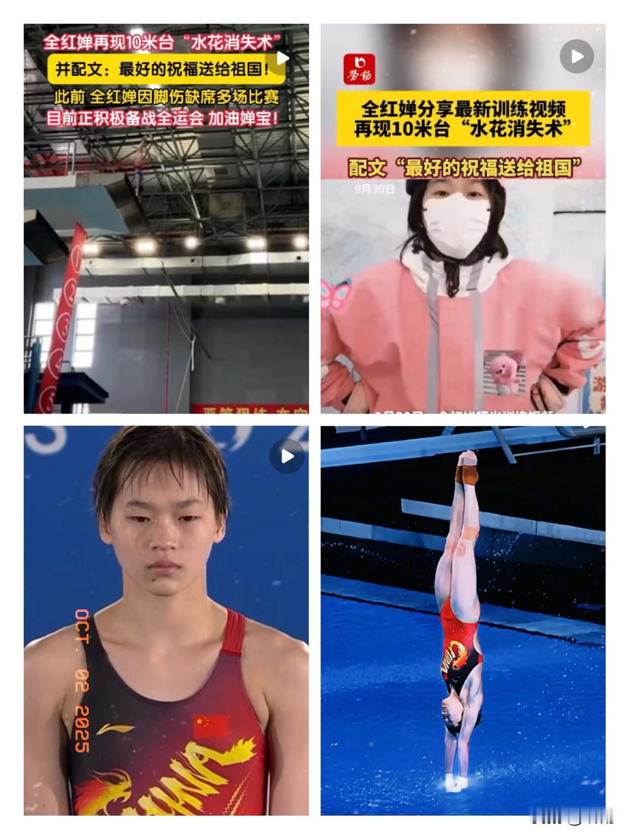 不鸣则已,一鸣惊人! 国庆前刷到全红婵的训练视频,直接看愣了!这哪是跳水,明明是“水花消失术”现场返场,人一入水涟漪都没翻几下就没影了,这丫头也太绝了! 哪是什么“一鸣惊人”,分明是沉默里攒够了劲儿。前阵子腿伤、发育关搅得人揪心,还有人瞎猜她要退役,结果人家闷头练,一边当暨南大学新生补学业,一边每天加练抠动作细节,连207C都拆解成好几个步骤磨。 最戳人的是这份实在,不说大话,直接用训练视频当国庆献礼,配文就一句“最好的祝福送给祖国”。没有花哨噱头,全是硬实力的底气,这才是真招人稀罕。 原来“一鸣惊人”从不是突然开挂,是把质疑和困难都沉进水里,再用千百次练习换一次惊艳。全红婵 全红婵勇夺冠 全红婵传奇人生 全红婵写真 全红婵世锦赛 全红婵跳水动作 全红婵走秀 婵红婵 全红婵名言 全红婵访谈金句 全红婵相册 全红婵广告价值 过度消费全红婵 全红婵直播间 跳水神童全红婵