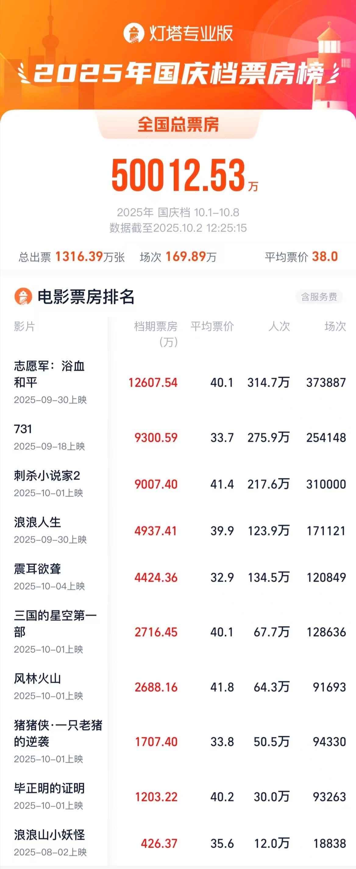 【2025年国庆档票房破5亿】据灯塔专业版实时数据,截至10月2日12时25分,