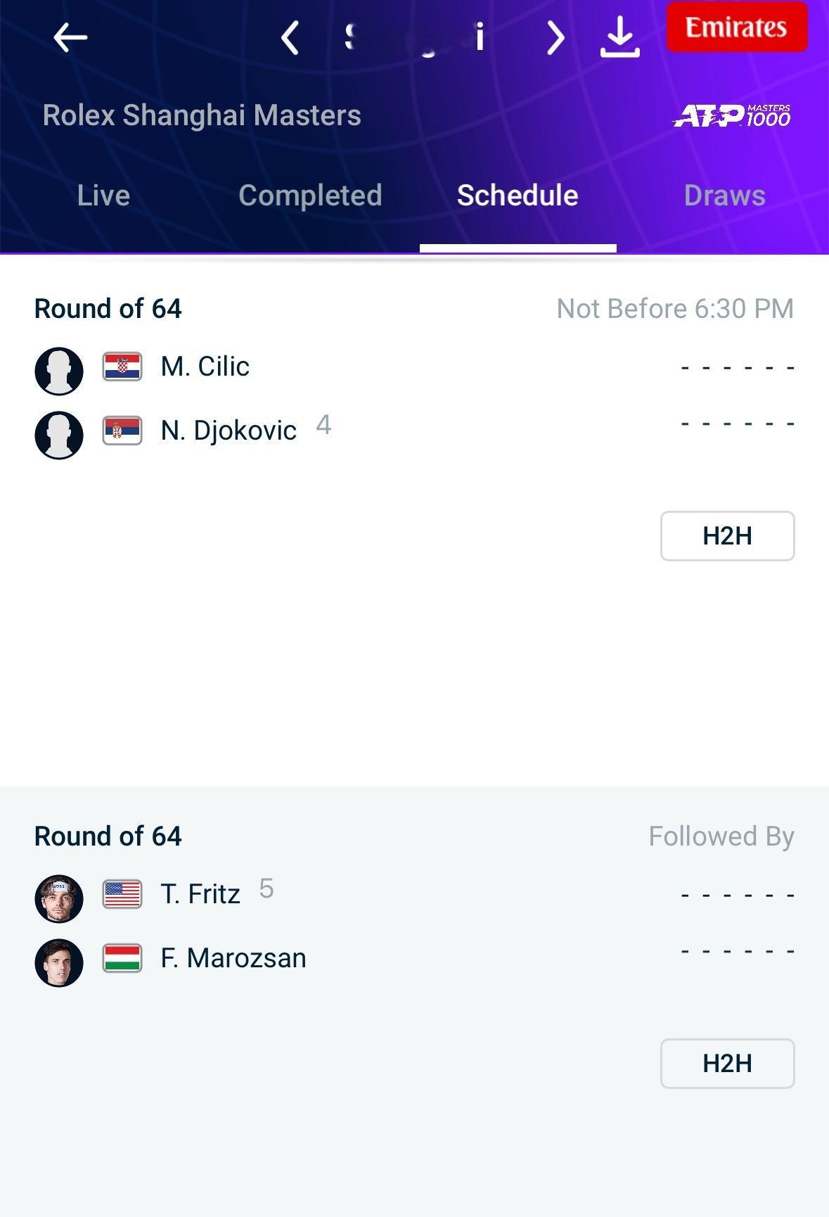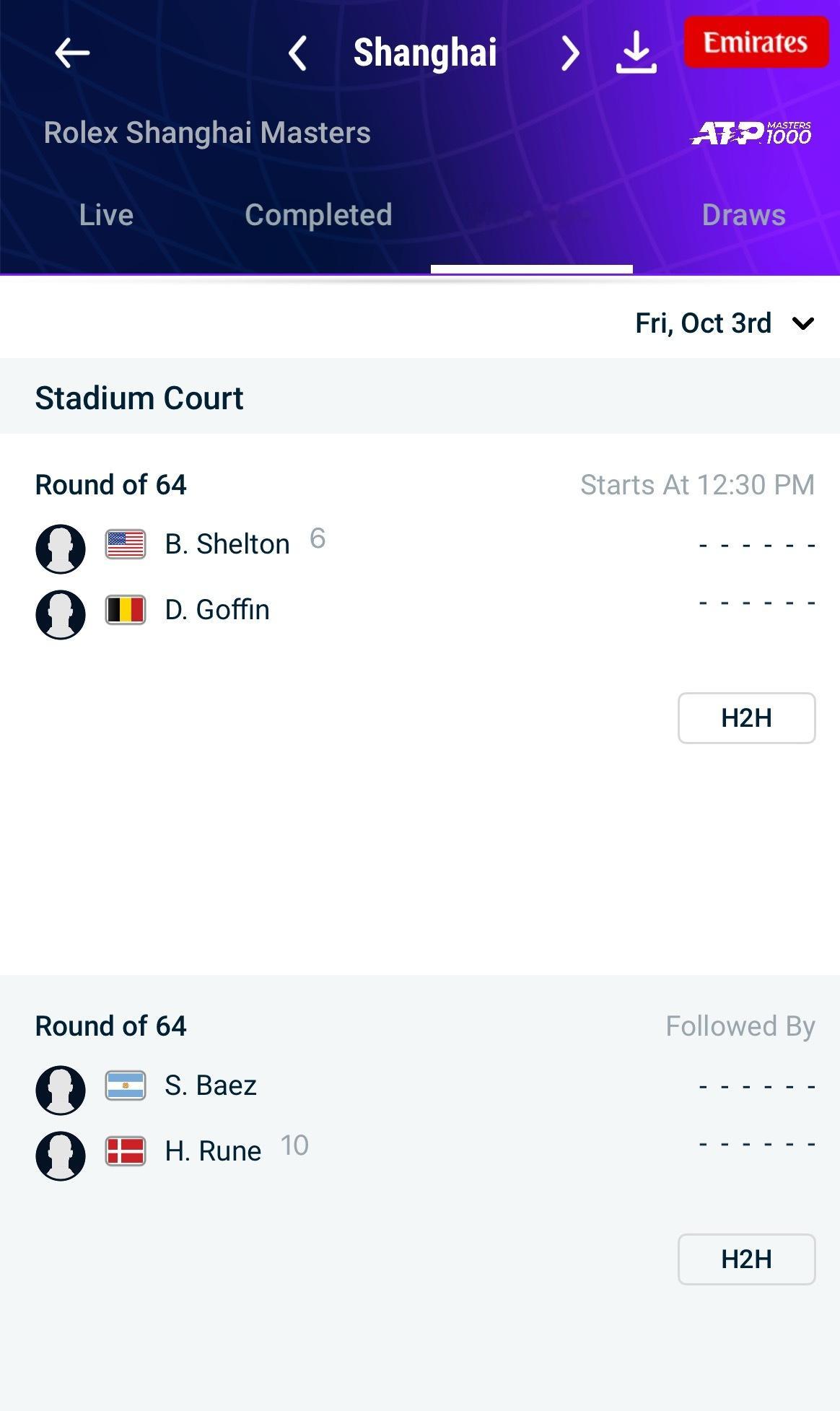2025上海劳力士大师赛周五10.3中央球场:谢尔顿、鲁内日场德约vs西里奇、
