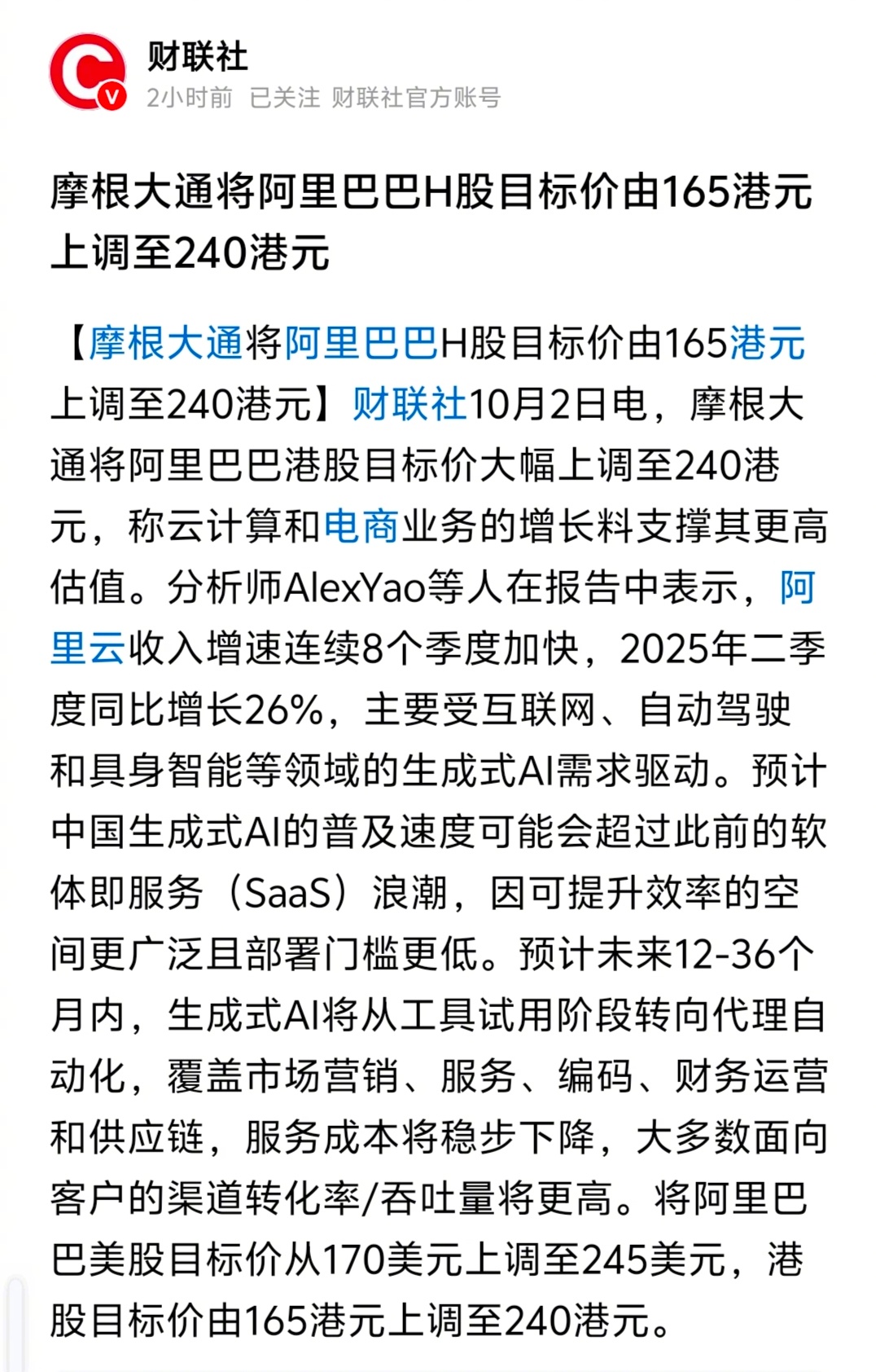 对阿里的云计算与电商业务持乐观态度,两家国际知名投行纷纷调高阿里港股目标价。