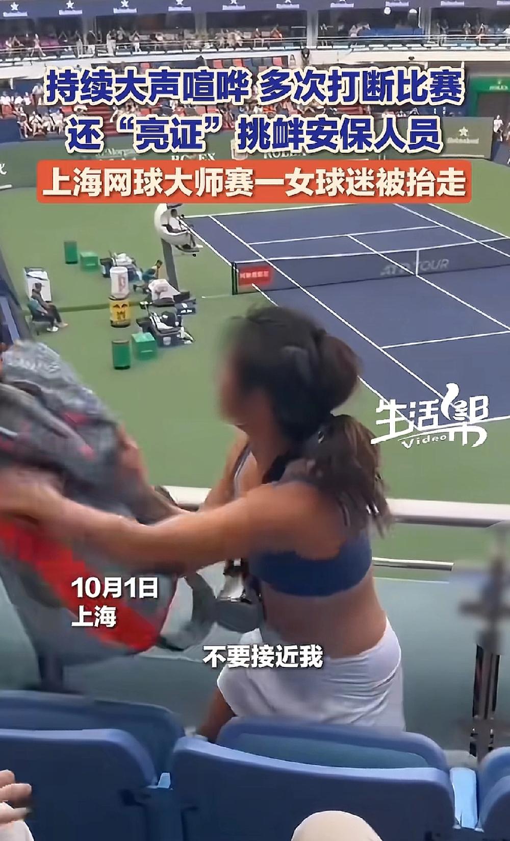 这下好了不仅网球届粉丝知道了, 现在就连全国人民都知道了, 10月1号,在上海举办的网球大师赛,比赛进行的好好的,一位女子疯狂大喊大叫。 开始的时候裁判警告她,她一点都不在意,比赛继续,女子又开始大吼大叫,丝毫不考虑其他粉丝的心情,也不管选手是否能听到。 就这样多次警告后,工作人员看不下去了,也警告她,没想到这名女子,不以为耻,反以为荣。 拿出了他的证件,疯狂挑衅工作人员,工作人员请她出去她不出去,还往工作人员脸上吐口水,工作人员脾气真的太好了。 应该判她个挑衅公职人员的罪名,进笼子关几天,让她老实老实,真是有娘生没爹养,外国人素质也真的差! 最可怜的就是她身边的孩子了,多次想阻止女子都不听,小孩子害怕的都快哭了,女子还对着孩子大吼大叫。 现在观众也是给力,为了能让这女子赶紧出去,这女子身边的观众都纷纷让出路来让工作人员好出手。 最后女子被抬了出去,现场观众都拍手叫好,工作人员还贴心的把他她身边的孩子先抱出去,很想知道如果这事发生在国外,老外会怎么处理?